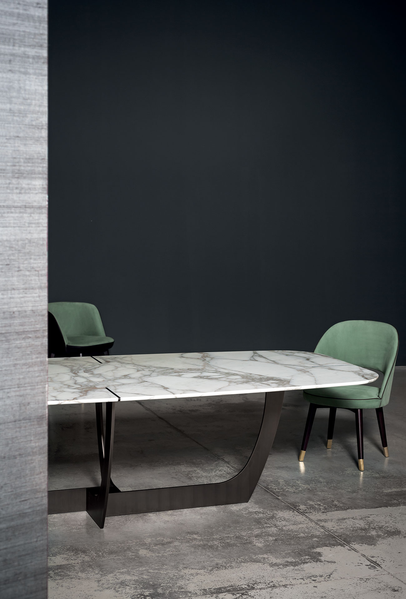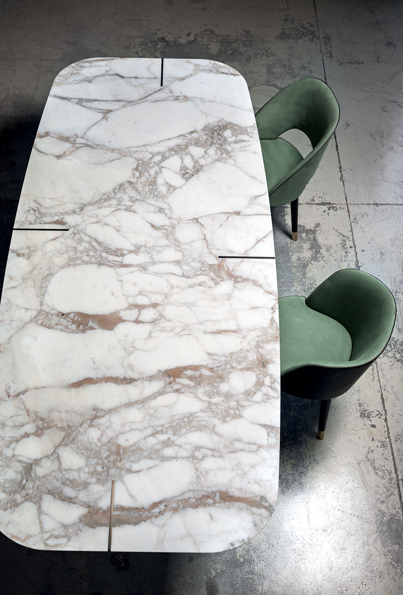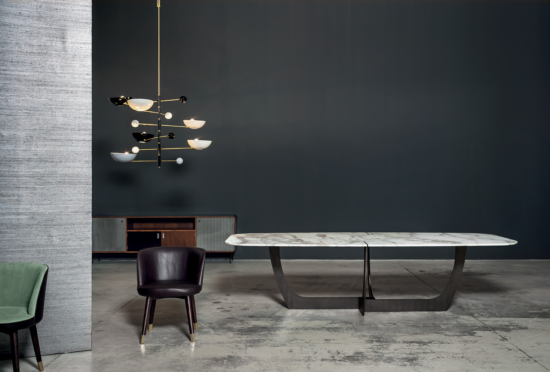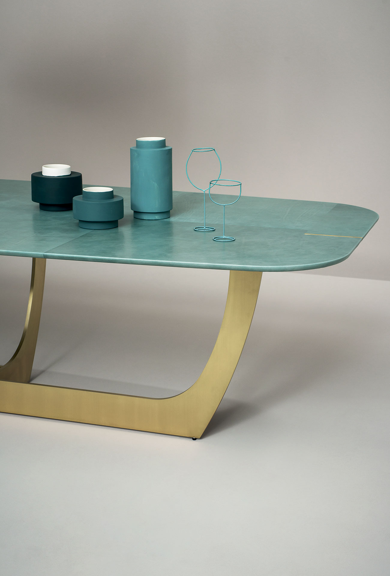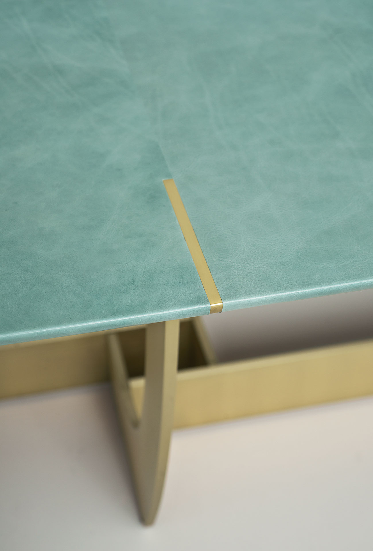 Base in antiqued brassed metal, hand-finished burnished metal or natural satin-finish metal with matte varnish laser cut 15 mm thickness. Marble or wooden top covered with leather with decorative inserts following the finishing and the positioning of the base. Marble top versions: glossy Gold Calacatta, glossy White Gioia Marble, glossy Bardiglio Grey.