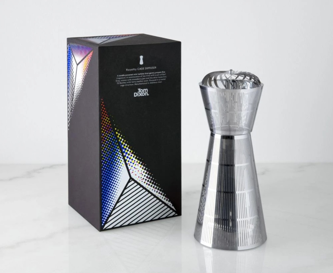 Cage is a candle-powered table top turbine, engineered to diffuse, accelerate and quickly propel the Tom Dixon fragrances to all parts of your interior. Manufactured from finely etched stainless steel this ingenious and original kinetic product is both magical and functional.
