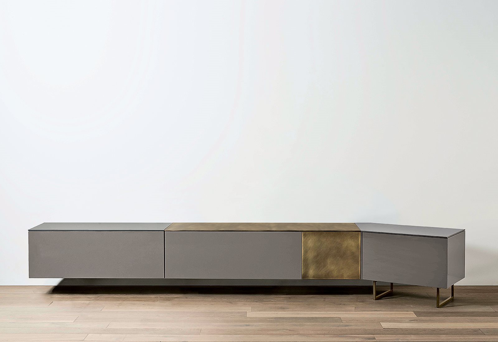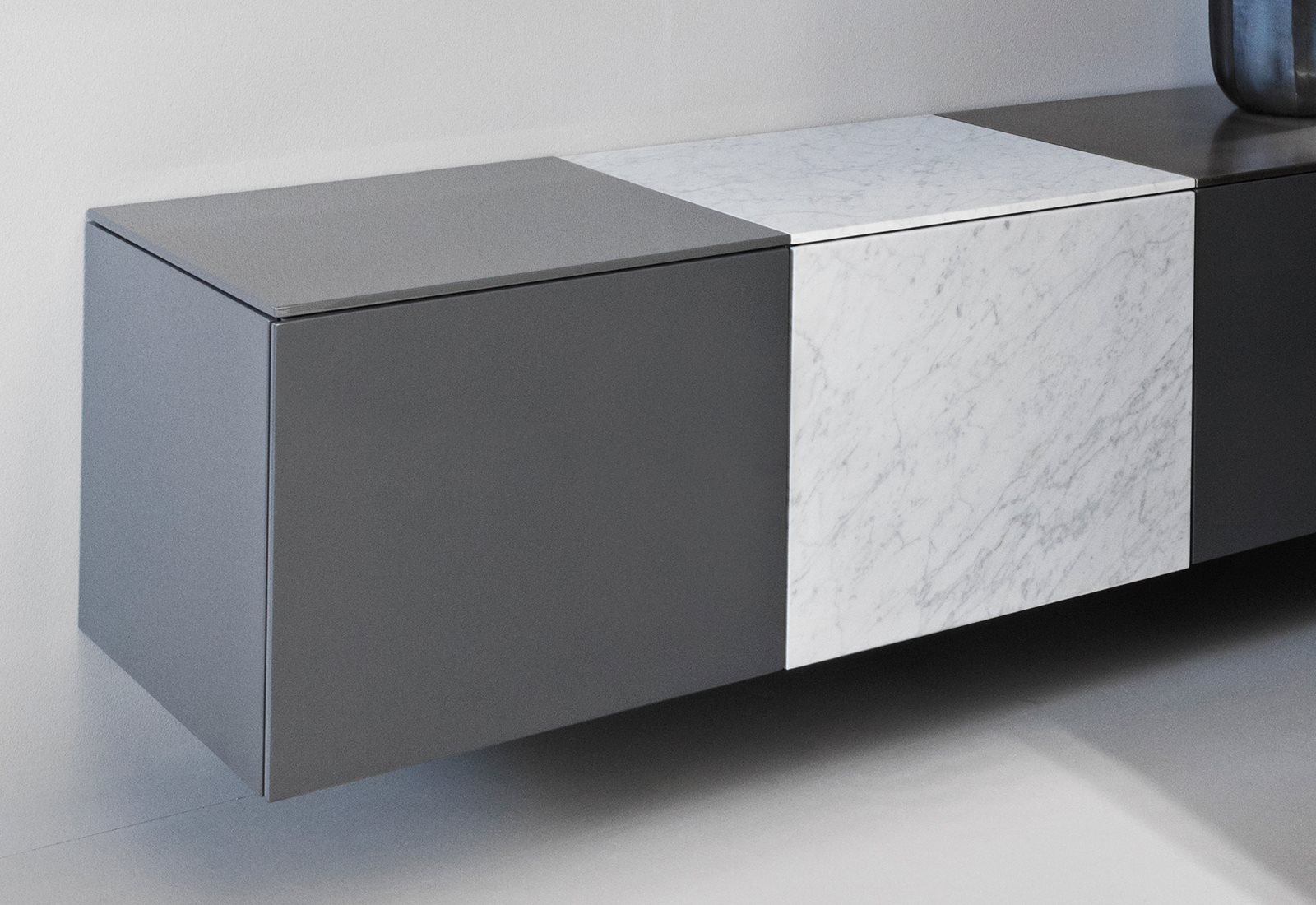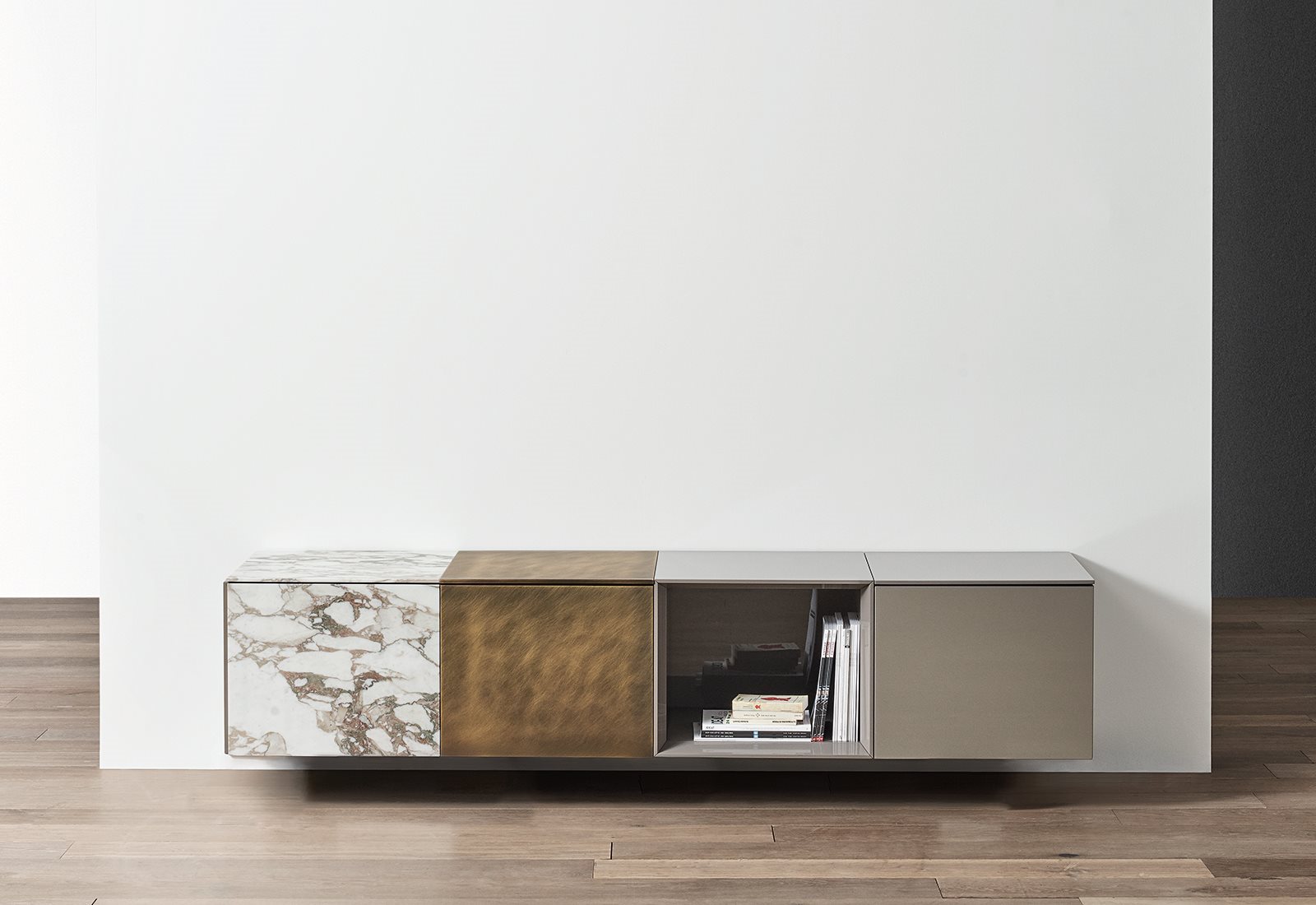A series of wall-mounted modular units characterized by pure lines and proposed in various finishes: open compartments, drawers and drop-leaf doors offer different options to show, divide and contain while the possibility of matching woods, lacquers, bronzed brass and marble panels offer great flexibility and sophisticated combinations.