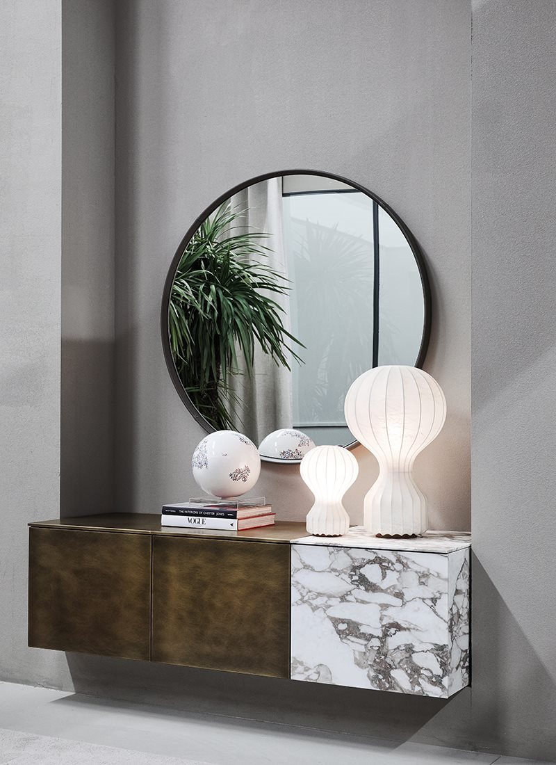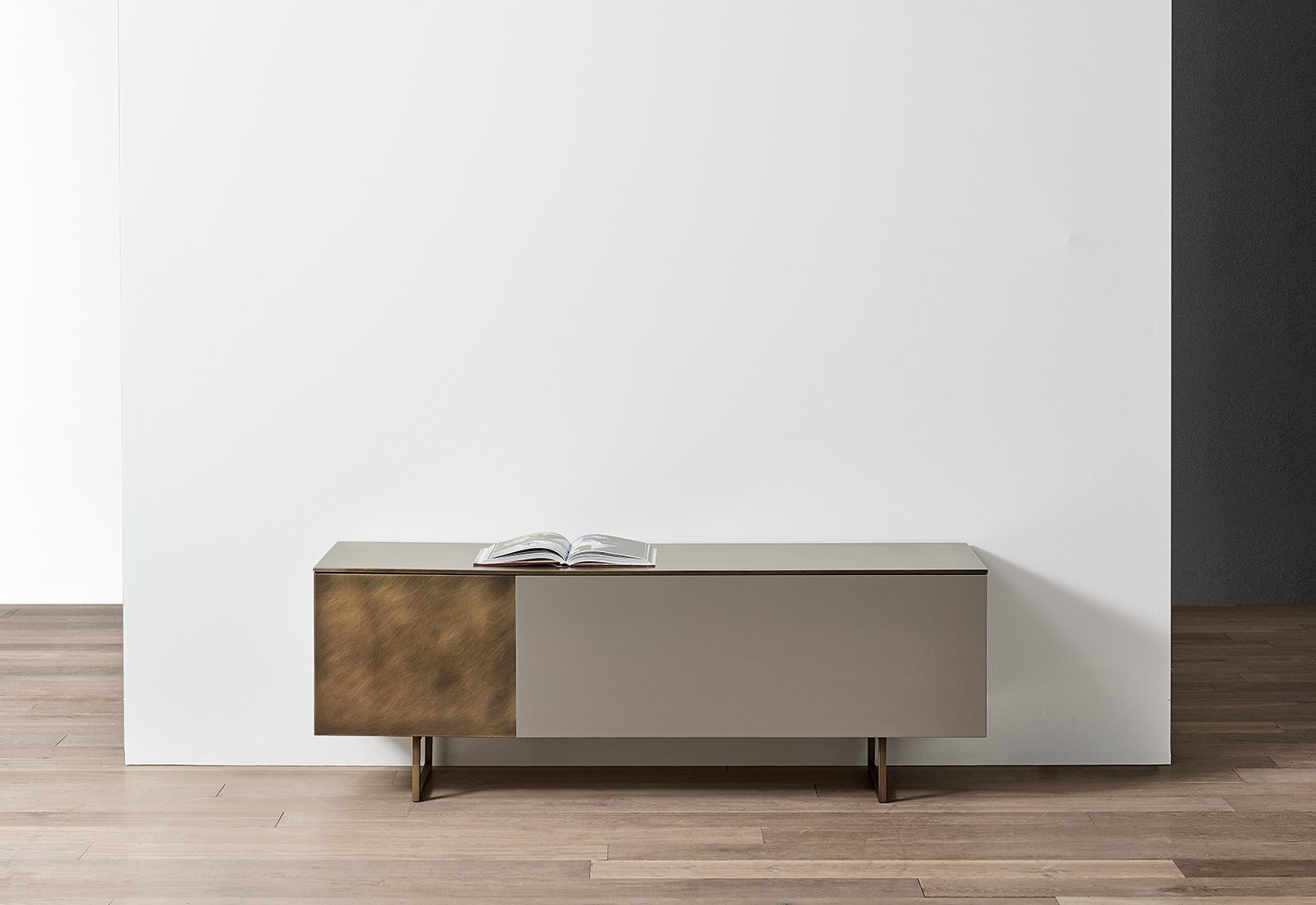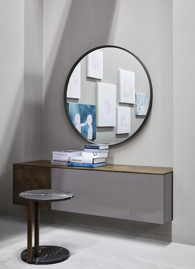 A series of wall-mounted modular units characterized by pure lines and proposed in various finishes: open compartments, drawers and drop-leaf doors offer different options to show, divide and contain while the possibility of matching woods, lacquers, bronzed brass and marble panels offer great flexibility and sophisticated combinations.