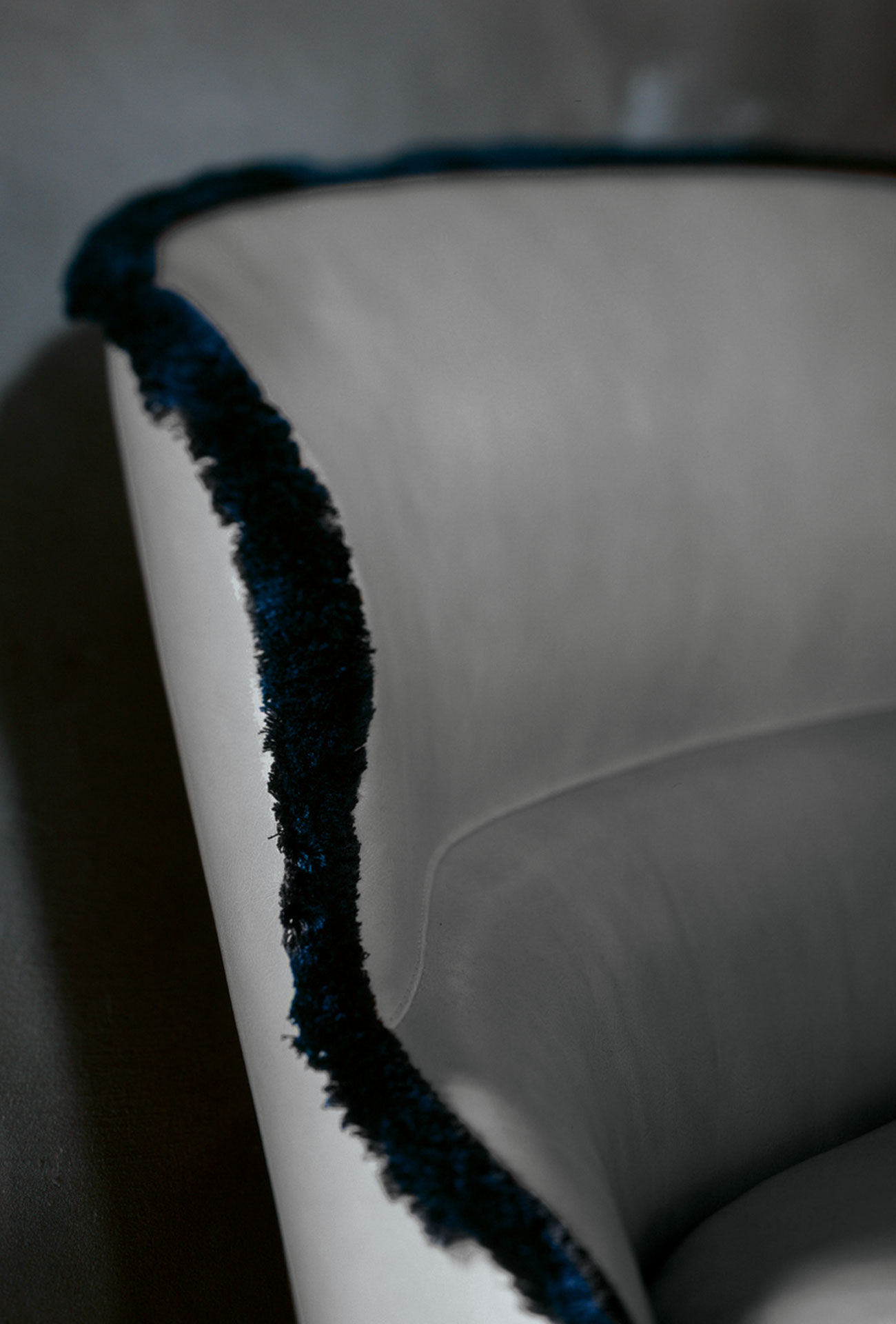 Sellerina armchair also available in “XL” version. Frame in fir and poplar. Feet in wenghé stained beech with wax finish. Filling in hand processed vegetable horsehair and padding. Seat springing with woven elastic straps of covered rubber. Seat cushion in washed and sterilized goose down and polyurethane foam filling. Back with loinrest in rigid polyurethane with vegetable horsehair and padding support. Piping with blue decorative braid.