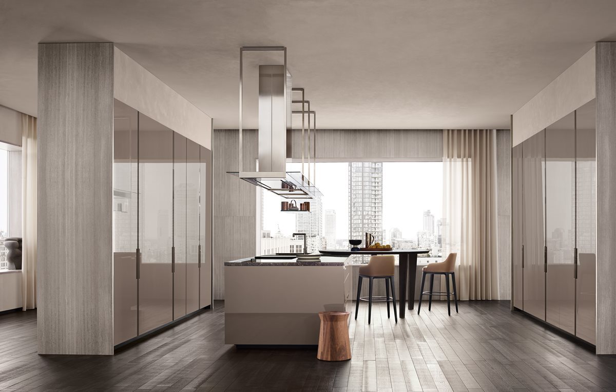 A model that is inspired, for practicality, to kitchens without handles, with a new and contemporary design, where a molding runs through bases and columns, resulting in a tapered cut, within which the characteristic built-in integrated handle is inserted.