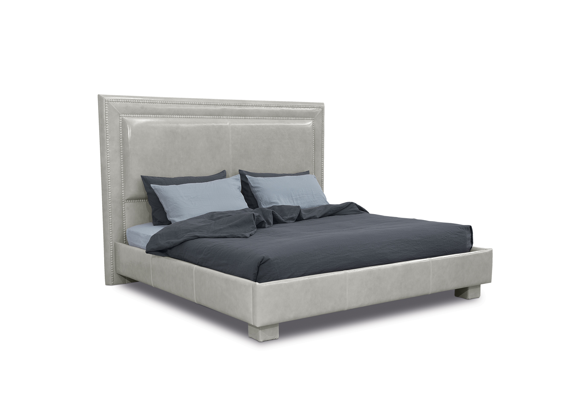 Plywood panel frame. Feet in plywood panel covered in same leather as bed. Differentiated density polyurethane foam filling. Available with studs in antiqued metal or with leather buttons. A mattress can be purchased separately. The inner of the headboard in a different kind of leather or colour is available on request with no surcharge.