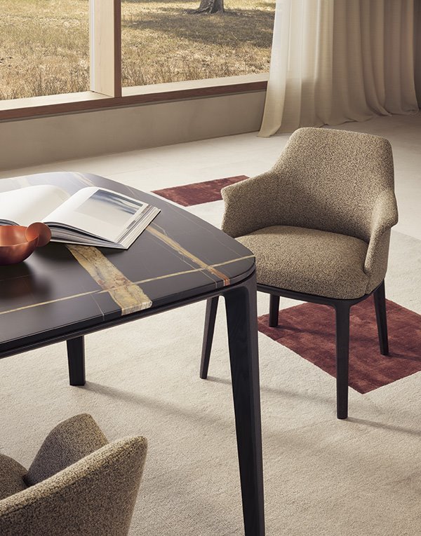 After the celebrated Grace comes her sister Sophie. Although her elegant silhouette recalls Grace’s forms, Sophie offers a seat of enveloping proportions and generous size. The detail of the design on the armrest delicately underscores the concept of cosiness, in contrast with the fine lines of the structure.