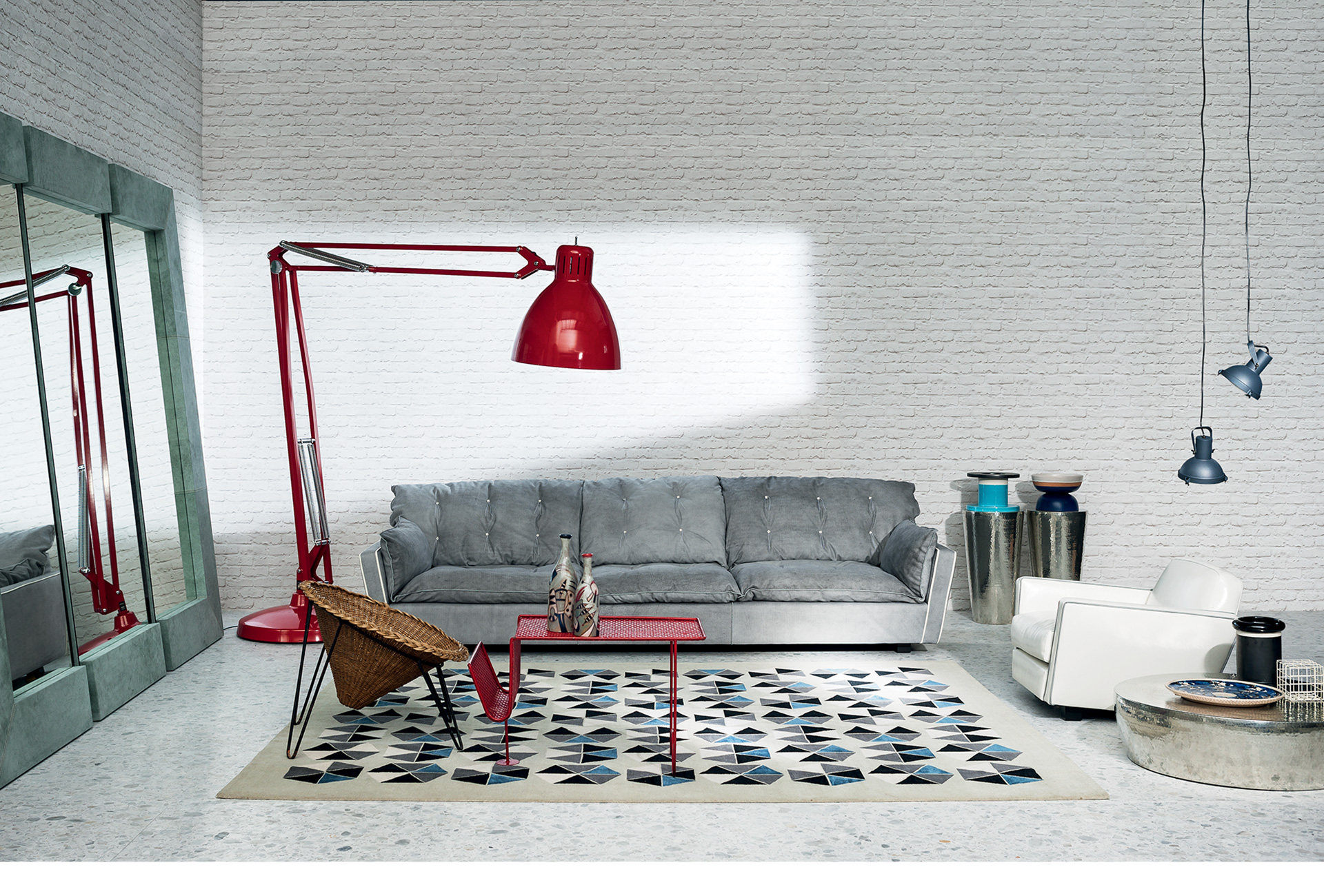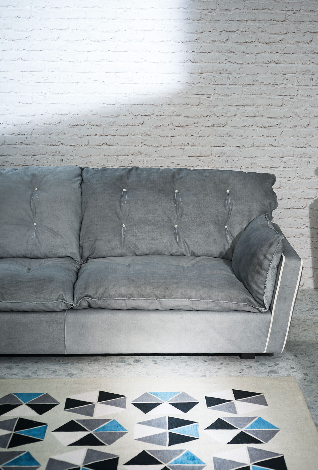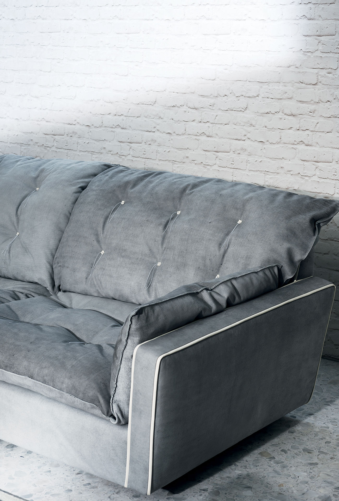 The sofa recalls classic shapes embracing like a nest, a cradle or a shelter. Fluffy overflowing pillows lean over a solid and rigorous structure. They are paunchy like clouds, characterized by small leather details that remind the mattresses stitching.