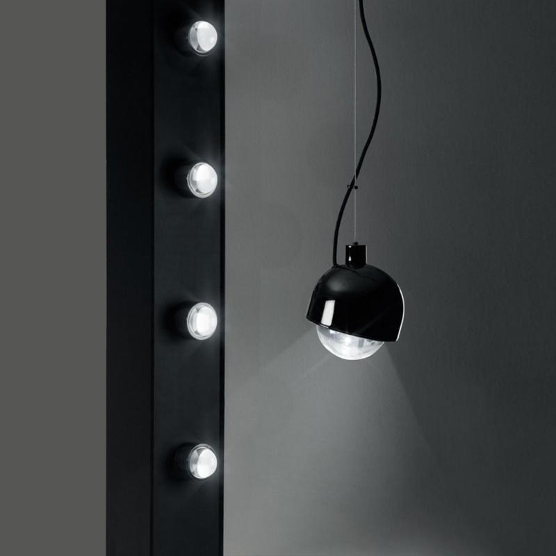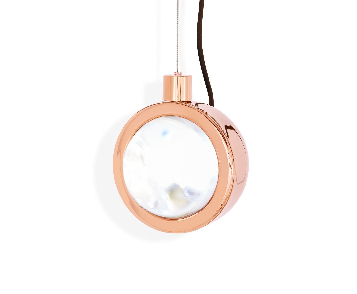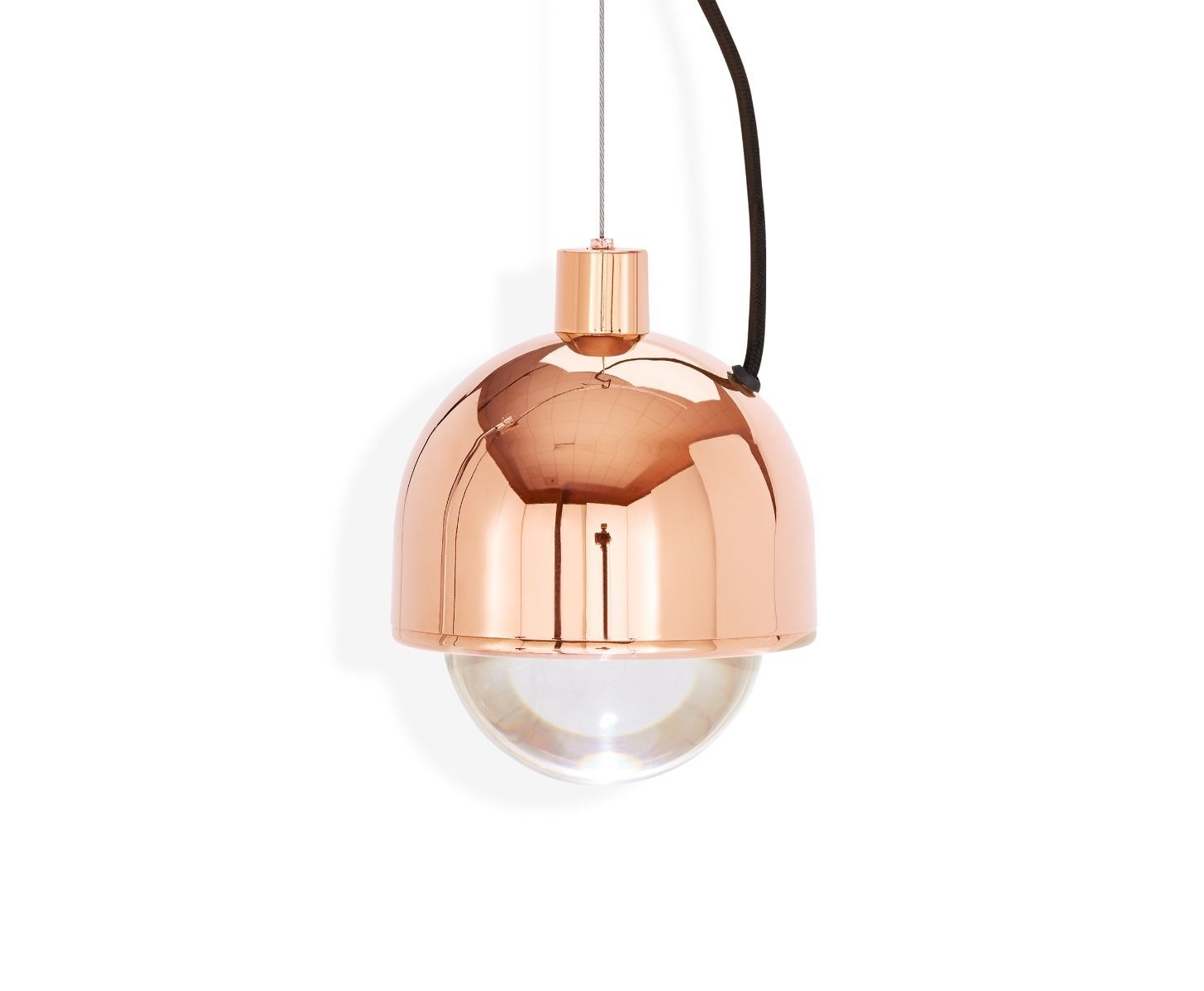 Framed in a plated stainless-steel surround, Spot Pendant is a massively thick glass lens designed to refract the light of integrated LEDs. Available in high-shine copper and glossy black. 6.3W integrated LED. Not dimmable.