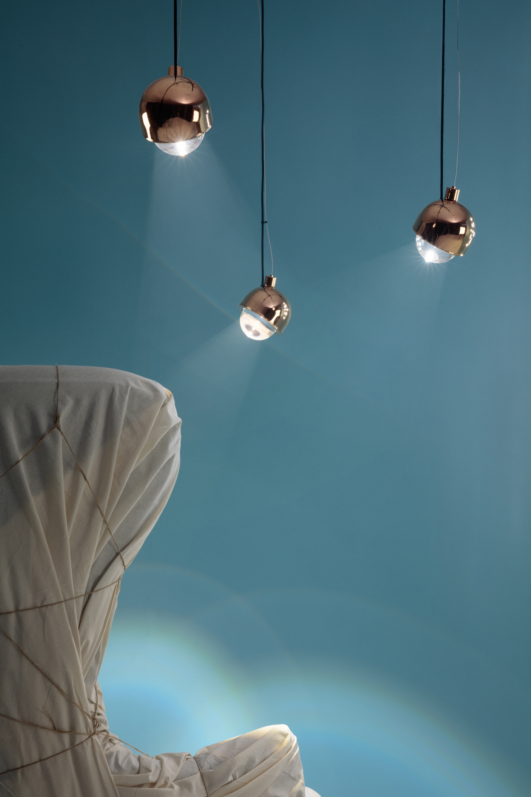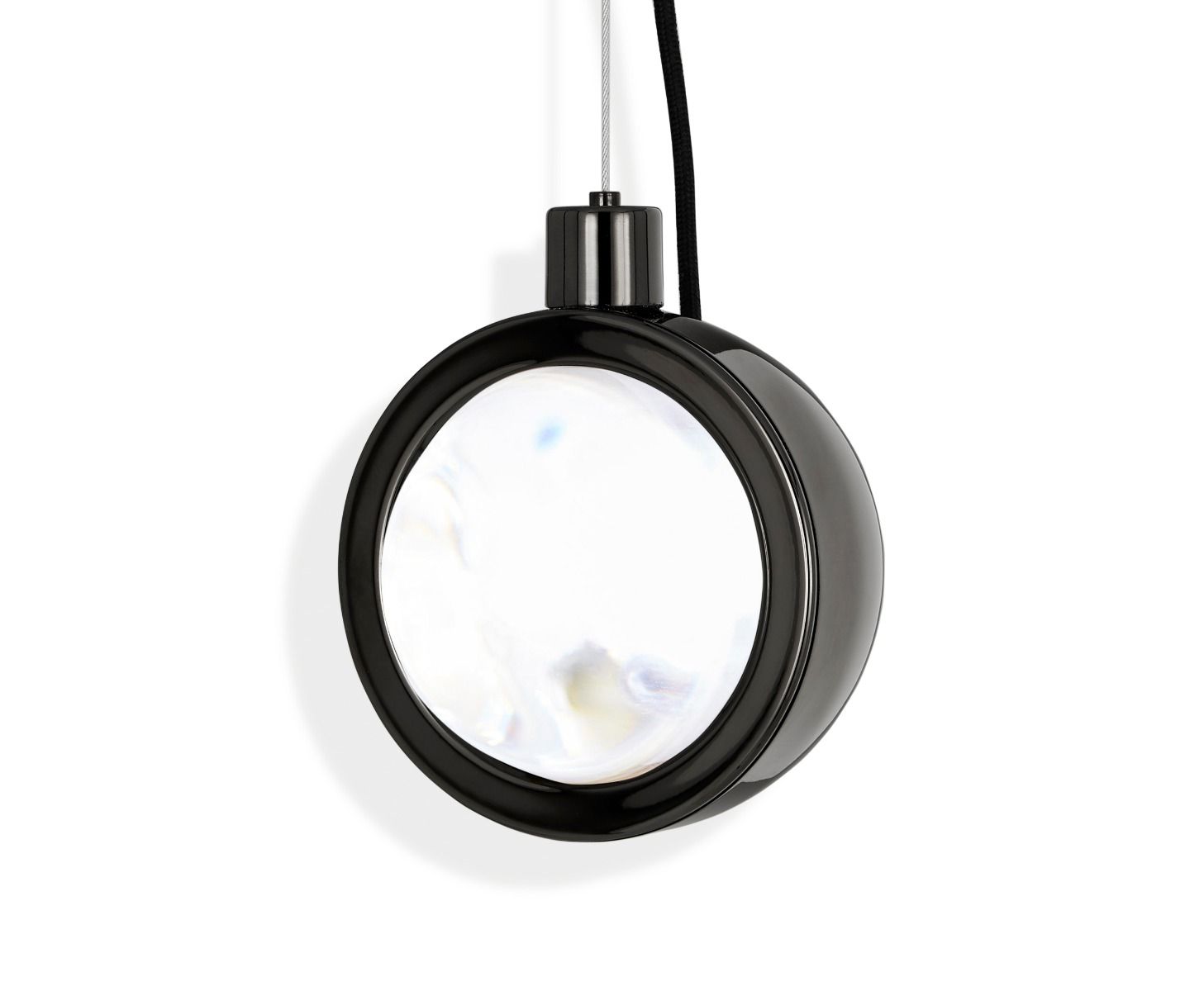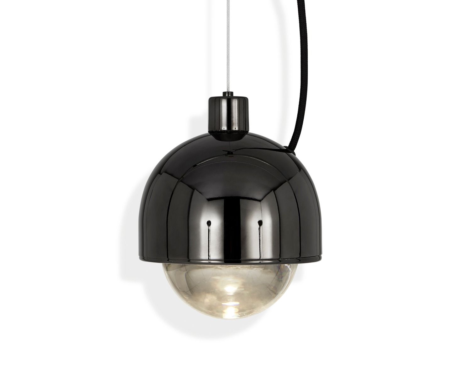 Framed in a plated stainless-steel surround, Spot Pendant is a massively thick glass lens designed to refract the light of integrated LEDs. Available in high-shine copper and glossy black. 6.3W integrated LED. Not dimmable.