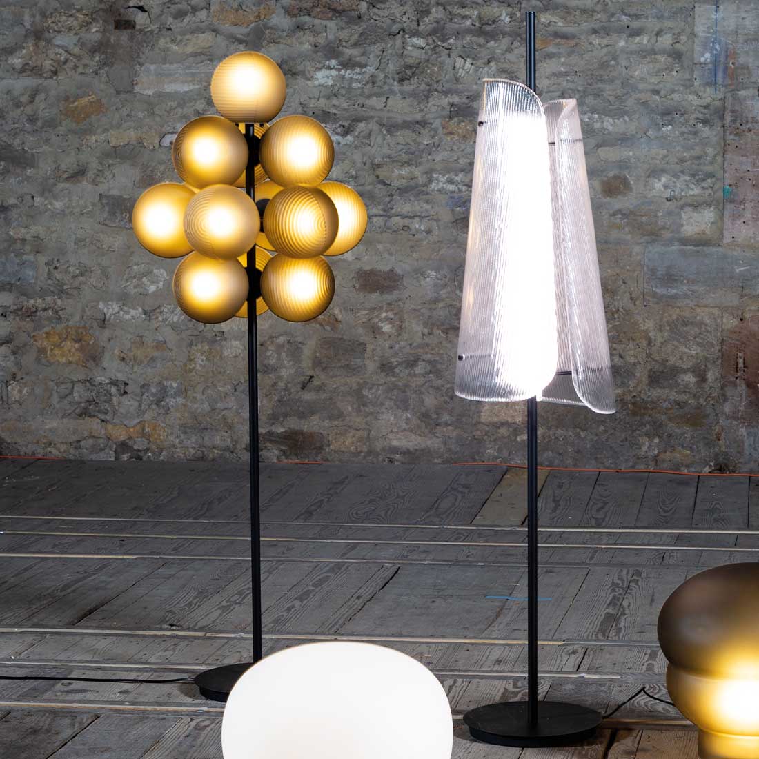 Raised up above the clouds on a simple black or champagne powder coated steel base, the stellar grape floor lamp will shine across your interior universe. A grouping of star-like spheres mixes frosted acetate illumination with a textured ripple. These handblown glass spheres offer the perfect mix of elegance and mystery for the rest of your interior to orbit.