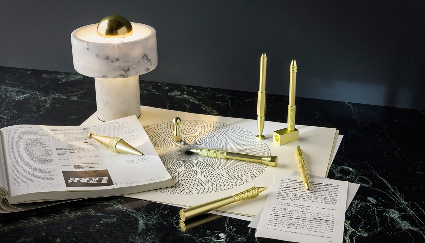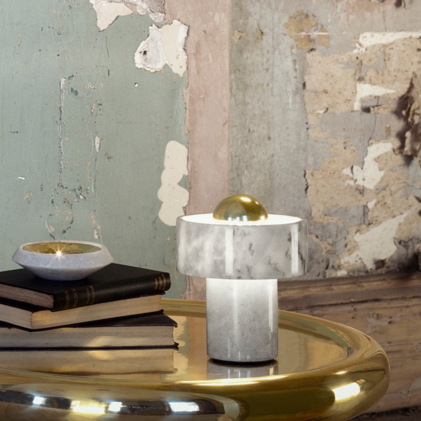 A play on our original Stone Spice Grinder, this Table Light comprises a halo hollowed from white Morwad marble mounted on a tube with a central ‘floating’ ball in the form of a brass tipped bulb. The stone is cut to the thinnest possible depth, so it appears to be semi-transluscent, emphasizing its patterned surface and casting illumination on to the surface below. The Stone Table Light has a neat, black chord, and the brass capped bulb is sold seperately.
