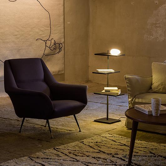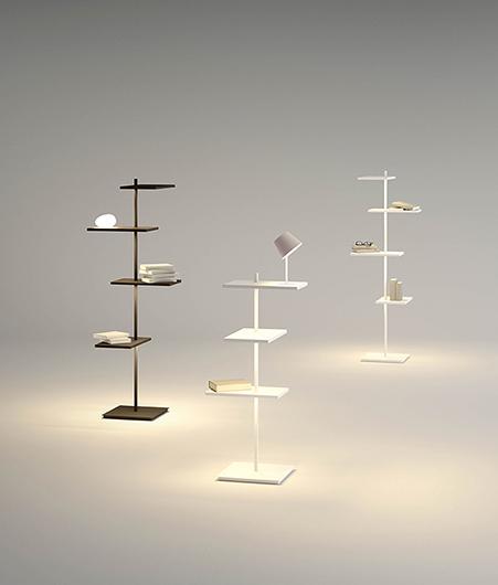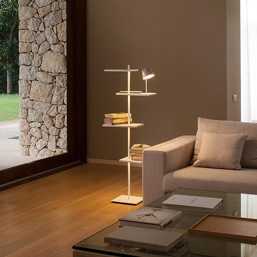 The Suite floor lamp is a creation of designers Jordi Vilardell & Meritxell Vidal. The Suite floor lamps combine two functions in one single piece: light fitting and item of furniture. A storage module with different shelves organised vertically at different levels and orientated in different directions. This floor lamp, available in two sizes, is an ideal auxiliary table or shelf with a table lamp for either end of a sofa. The light source is provided by a LED which is hidden beneath the shelving offering several lighting variations: general ambient provided by a luminous element and a reading light.