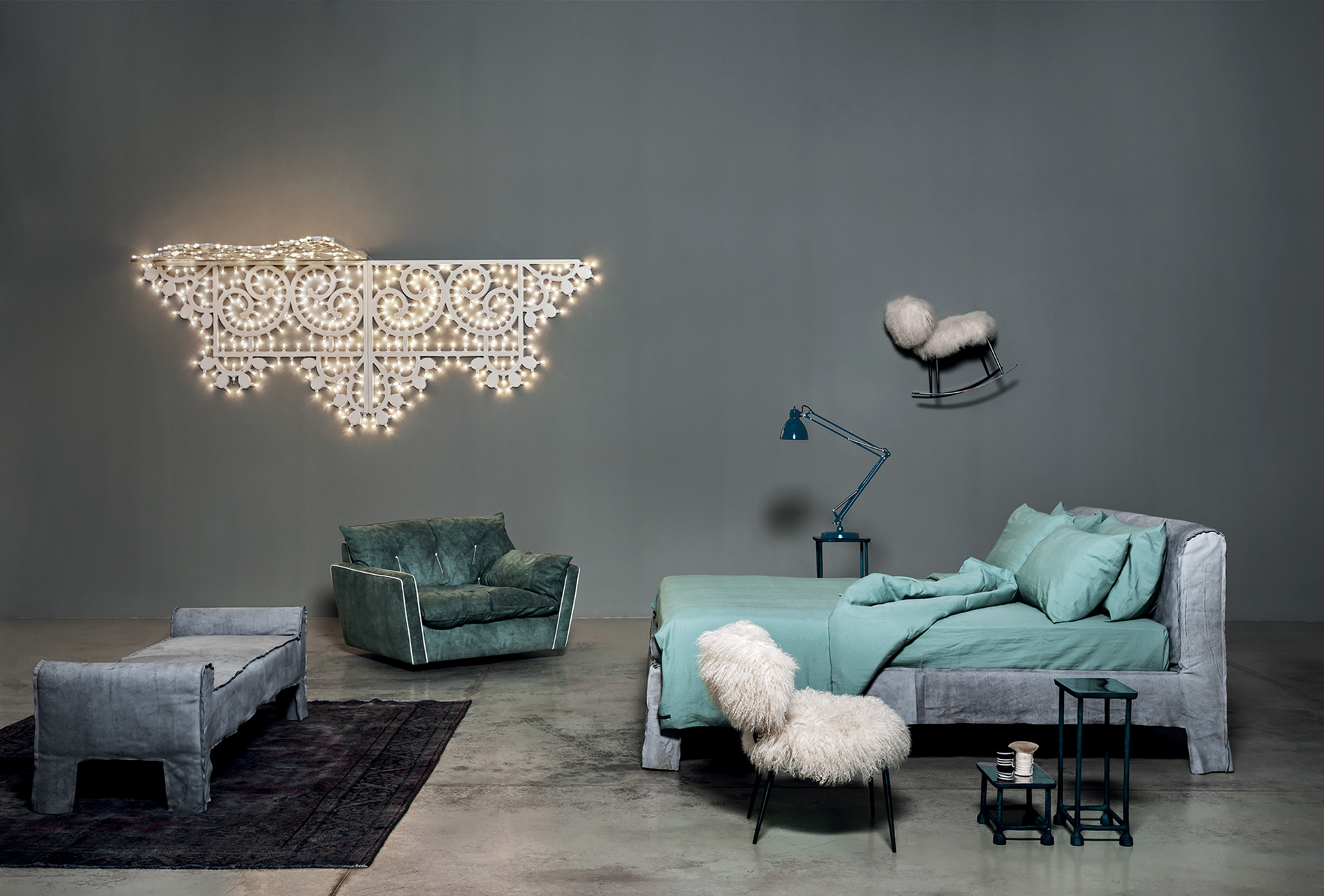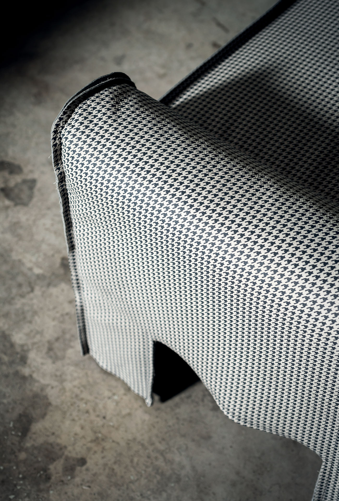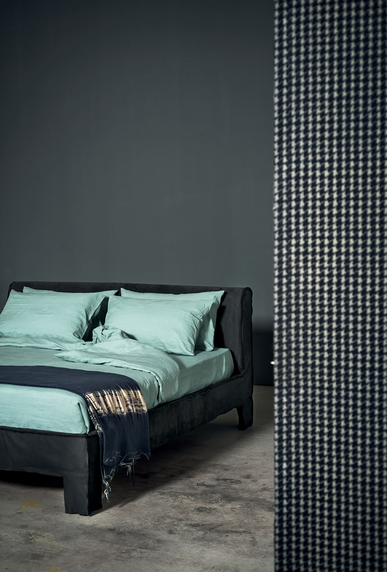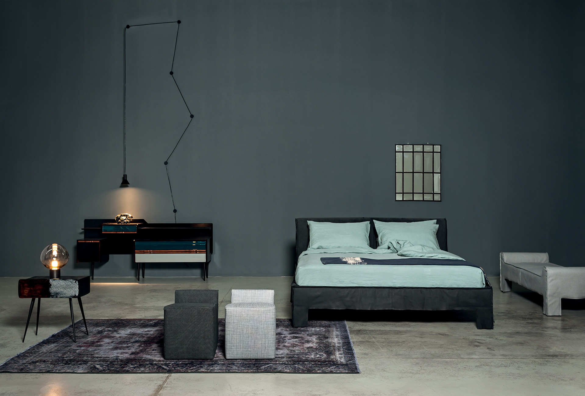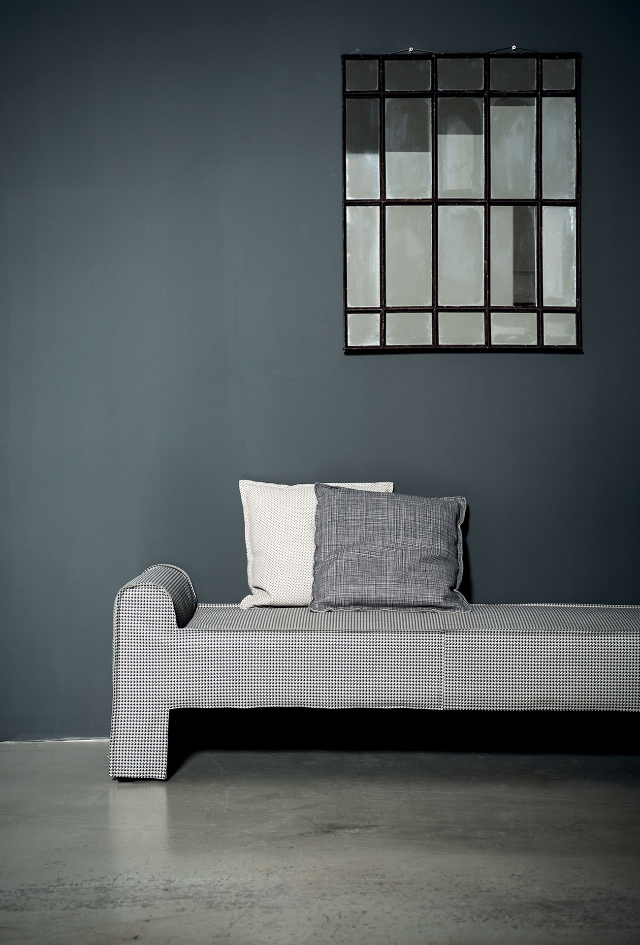 Double-panelled beech and poplar frame. Feet in beech and bed frame in poplar strips. Differentiated density polyurethane foam filling with acrylic fibre covering. Leather upholstery with sharp edge stitching. Available in all soft leathers. Bench combined.