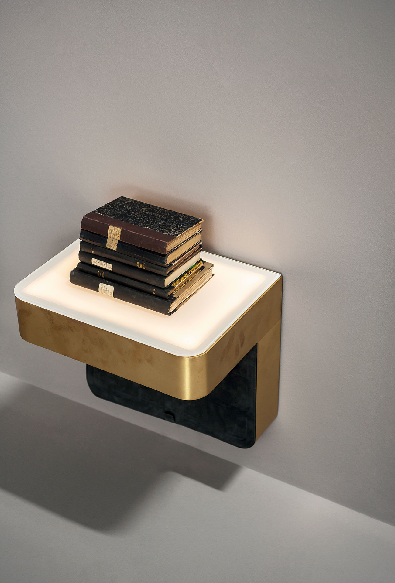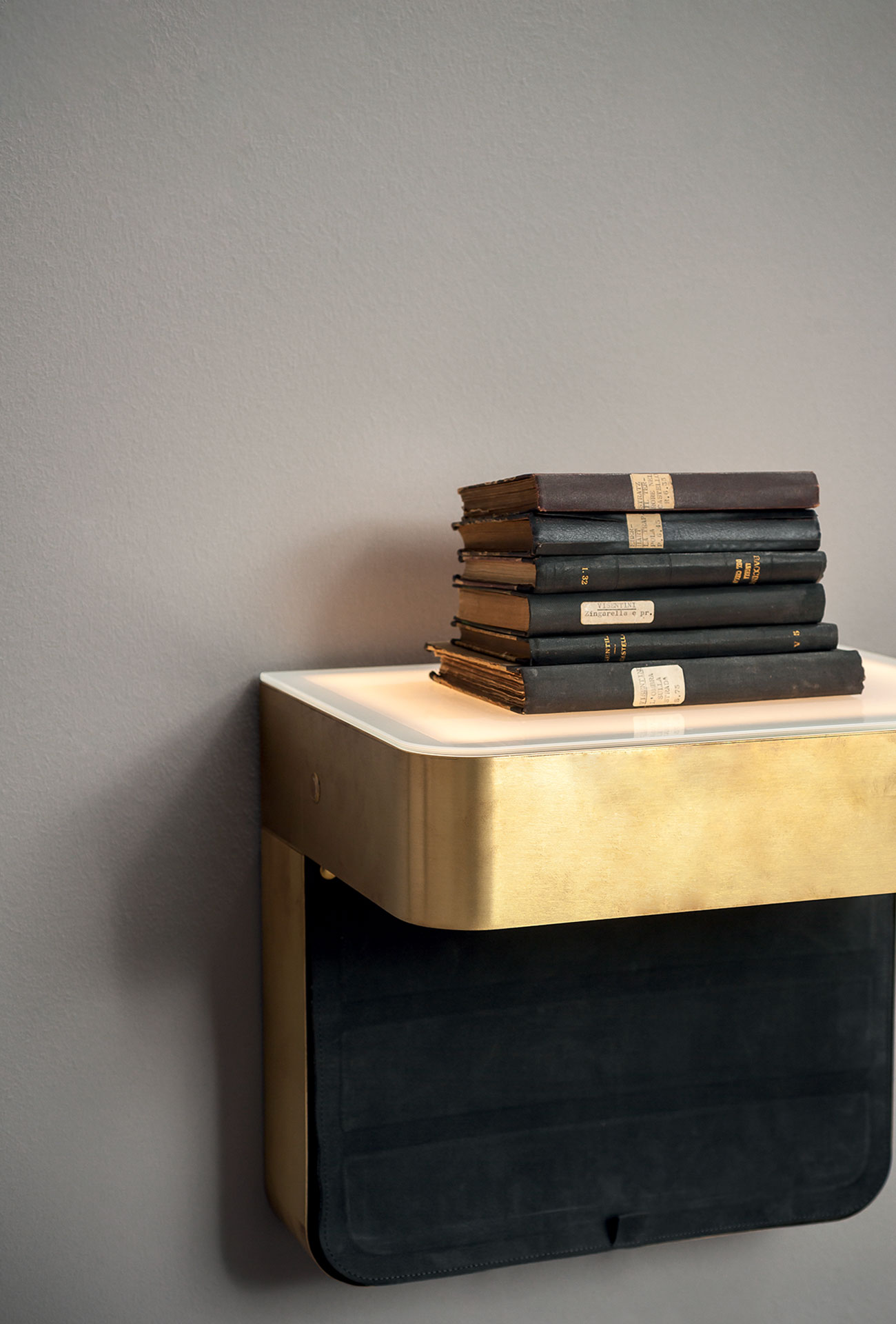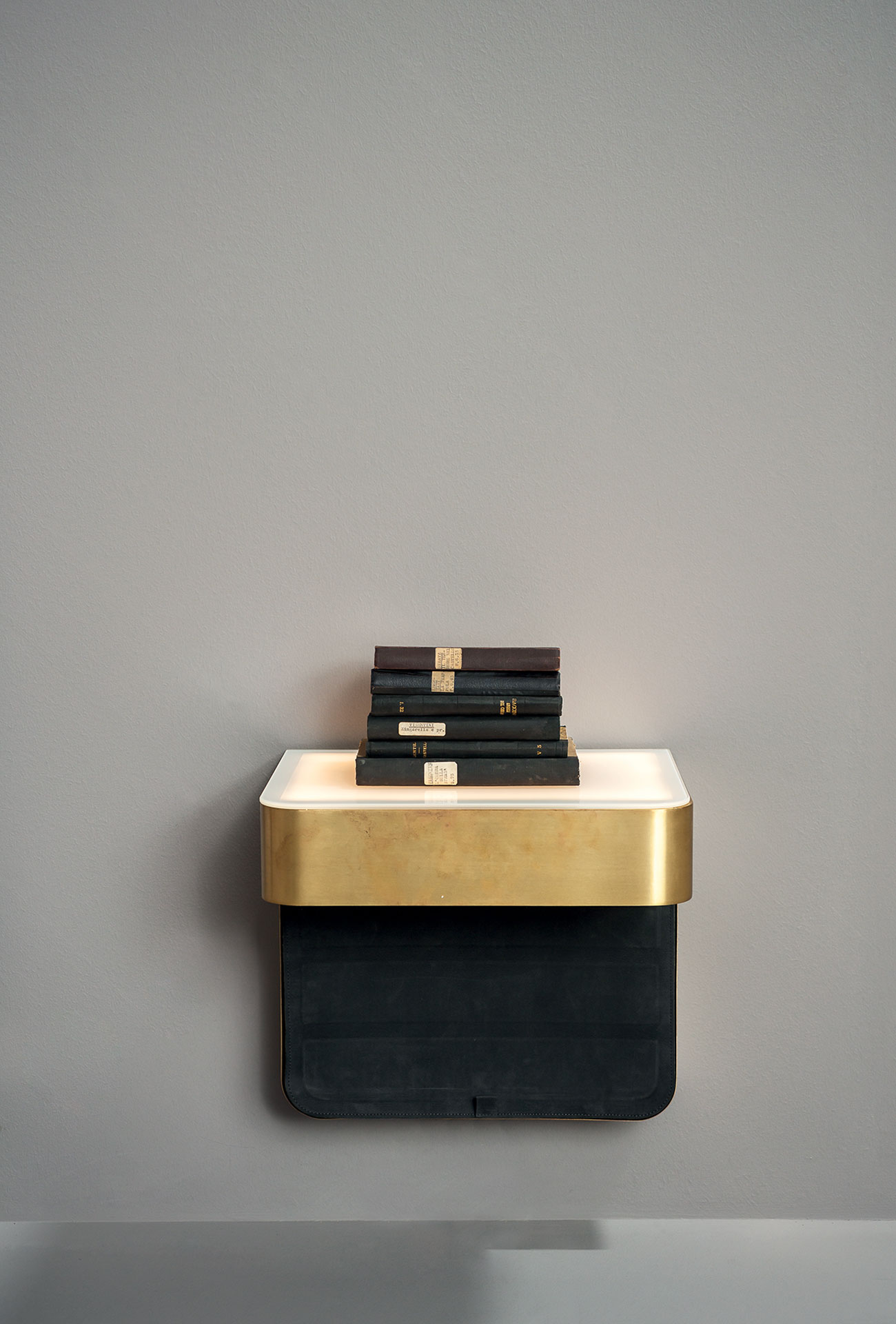 Hanging night table structure in black MDF, covered with satin brass or black metal. Glass top, 5 mm thick and with extra-light colour, screen-printed with two colours and a decoration. Inner led lighting with side switch.