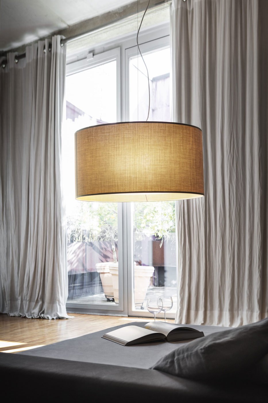 An object with clean lines becomes the protagonist of the space, enhancing the softness of the fabric through light.
