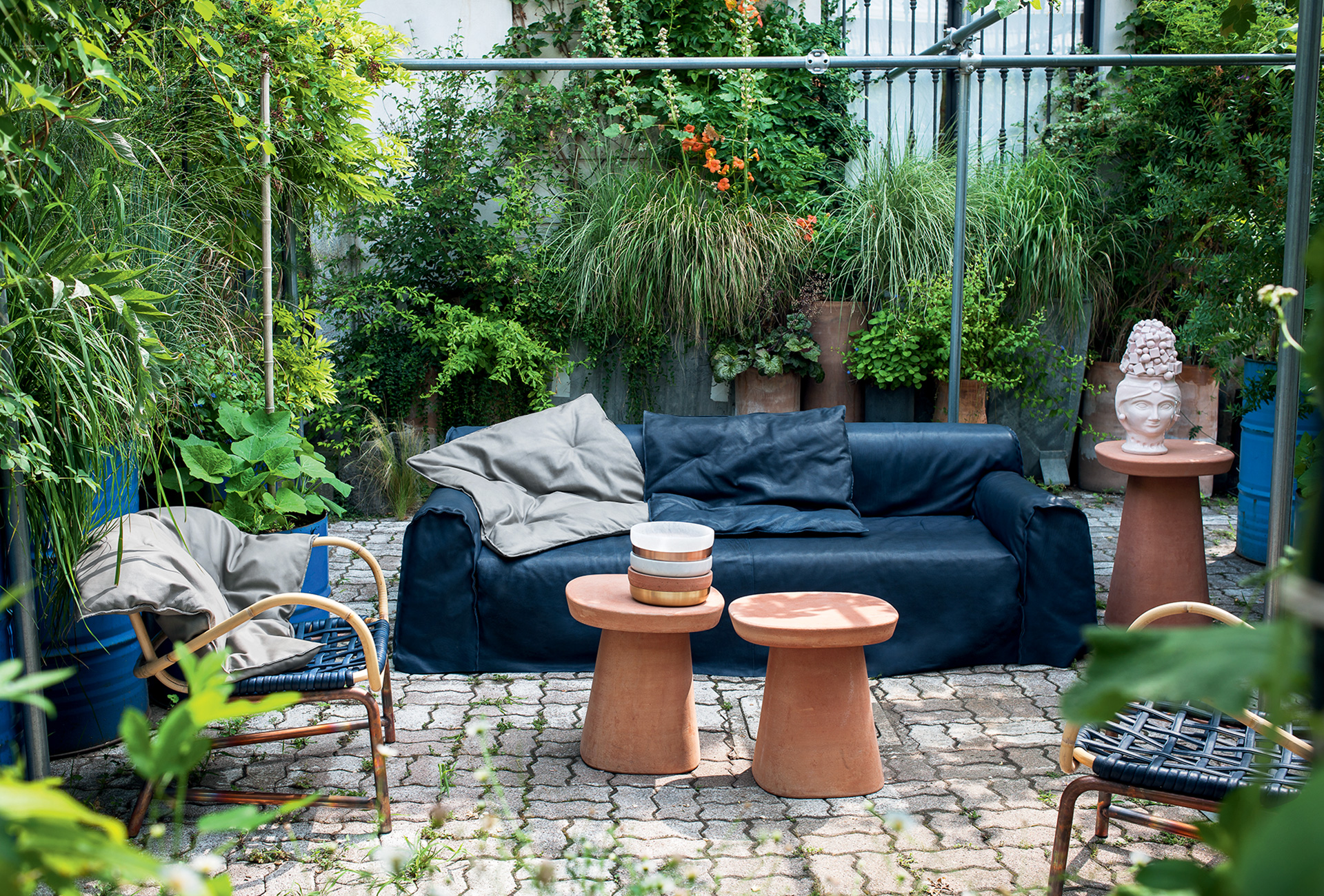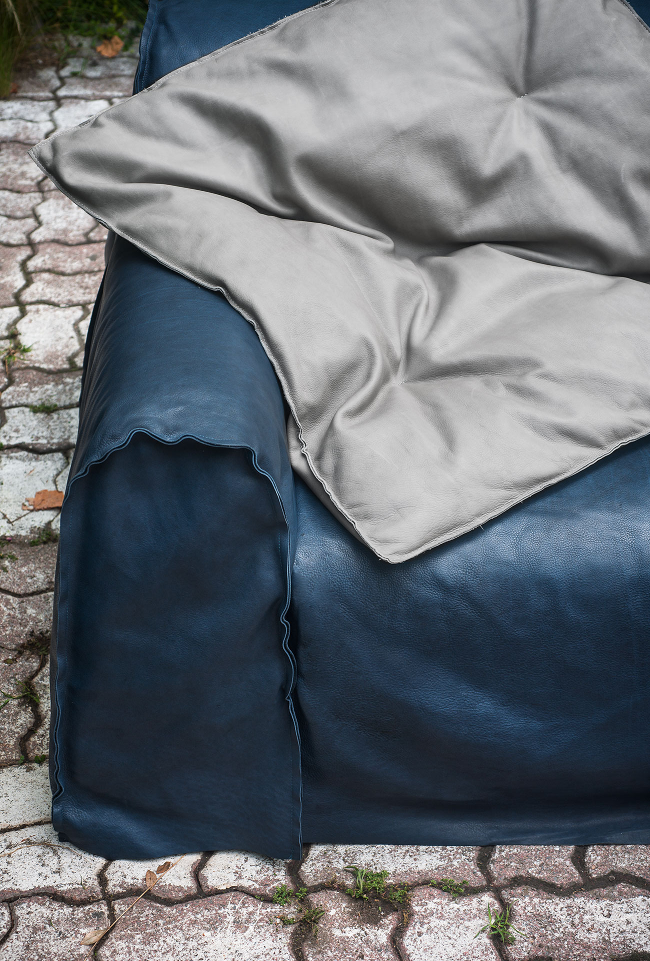 Structure in ocoumè wood and Chilean plywood treated with a protective product for outdoor. Nylon feet, suitable for outdoor. Padding in draining polyurethane foam, with water-repellent fabric. Leather upholstery with sharp edge stitching.