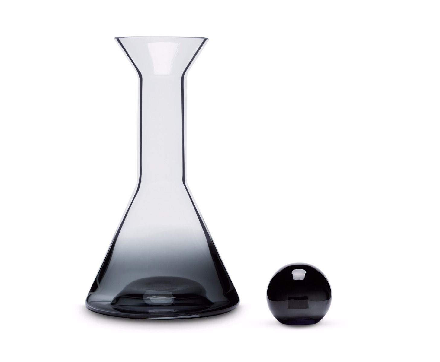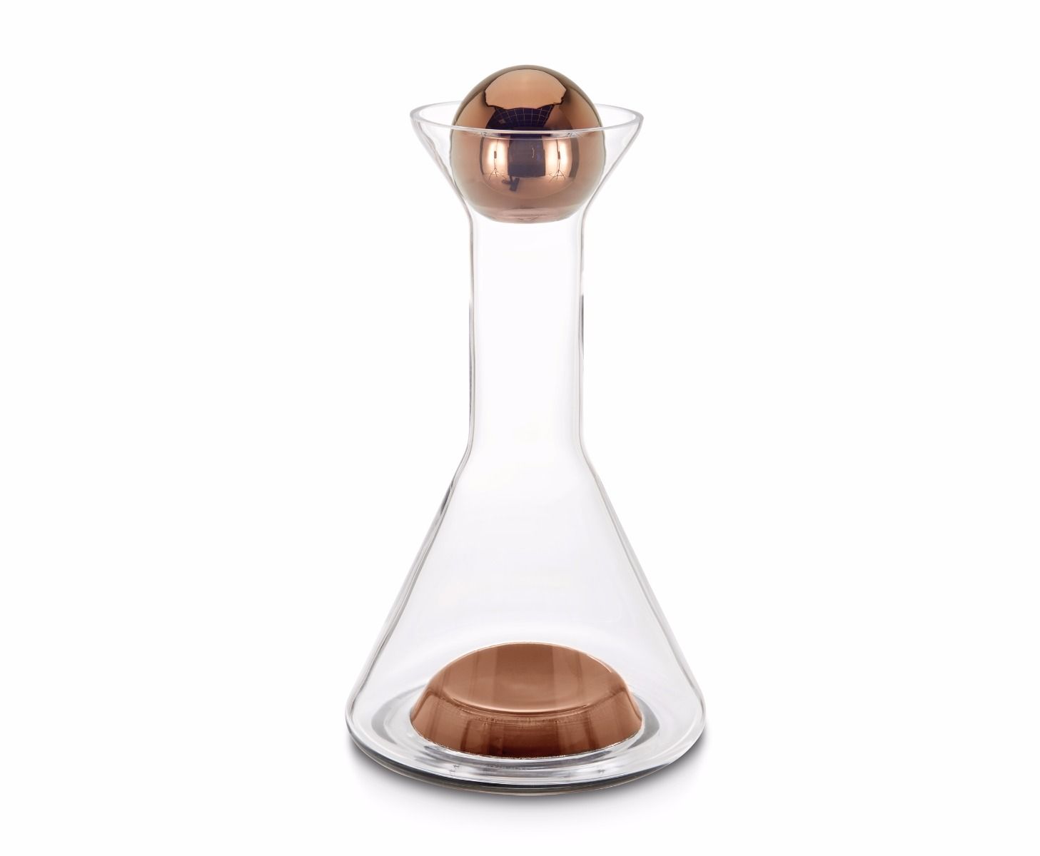 Characterised by a hand painted copper band, Tank takes its sculptural cue from the functional shapes and volumes of scientific glassware. Minimal yet decorative for a multiplicity of purposes of drinking, pouring, storing and displaying food and drink, the range forms bold building blocks of table-top architecture.