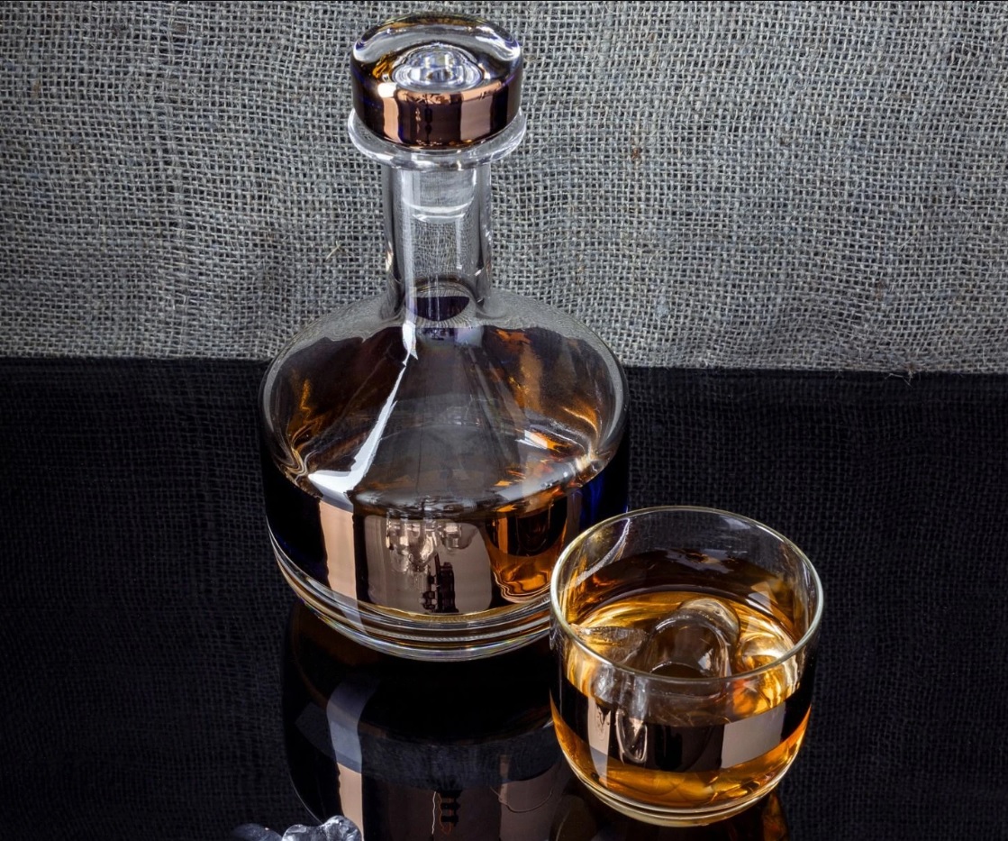 A Tank Whiskey Decanter for your best Scotch or Bourbon, presented in gift-worthy packaging. Mouth-blown and ornamented with hand-painted copper detailing, it forms part of a collection alongside our other Tank glassware and tableware. Also available in Black colour.