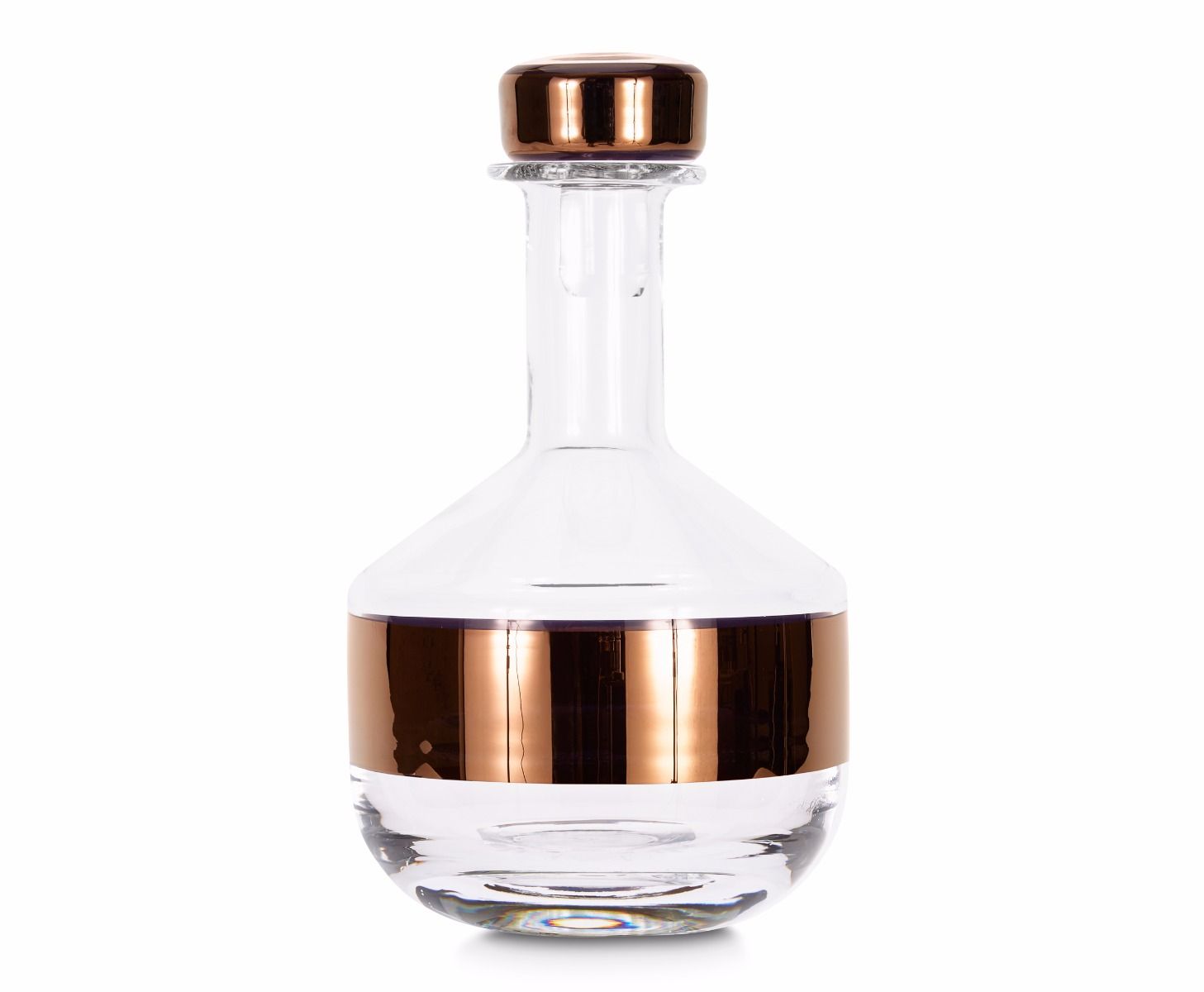 Characterised by a hand painted copper band, Tank takes its sculptural cue from the functional shapes and volumes of scientific glassware. Minimal yet decorative for a multiplicity of purposes of drinking, pouring, storing and displaying food and drink, the range forms bold building blocks of table-top architecture.