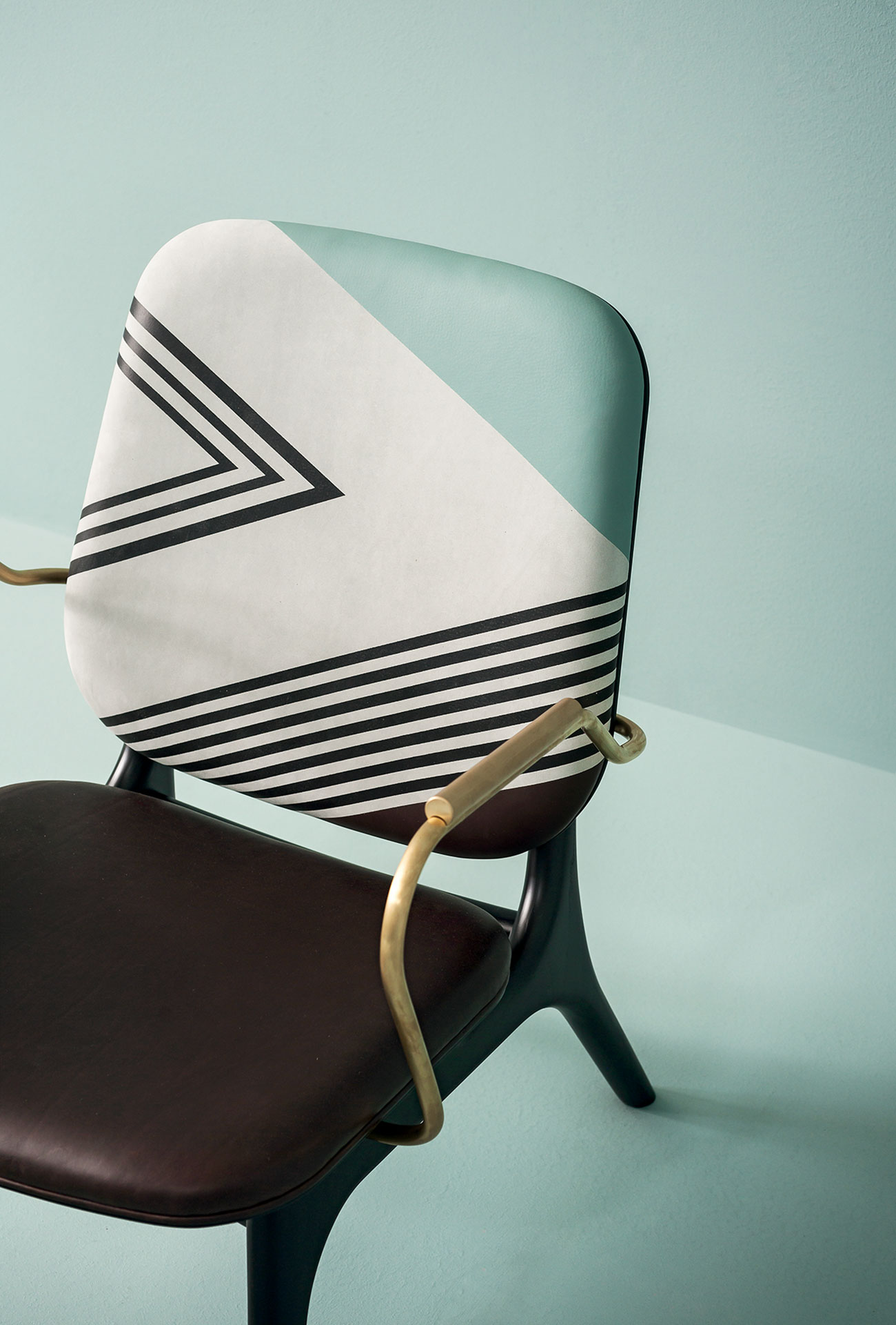 Semi-gloss black-laquered solid ash frame. Seat and back frame in curved birch plywood, black-stained ash veneered, finished with matte clear enamel. Armrests in satin brass reinforcing rod with matte varnish. Unique density polyurethane foam filling with acrylic fibre cover.