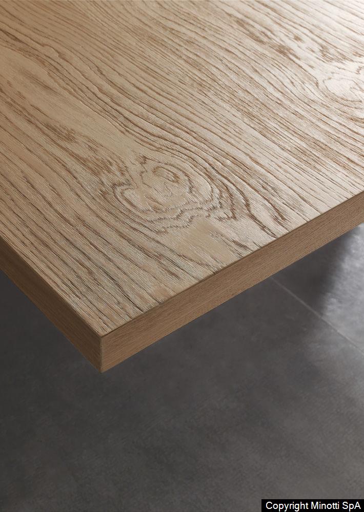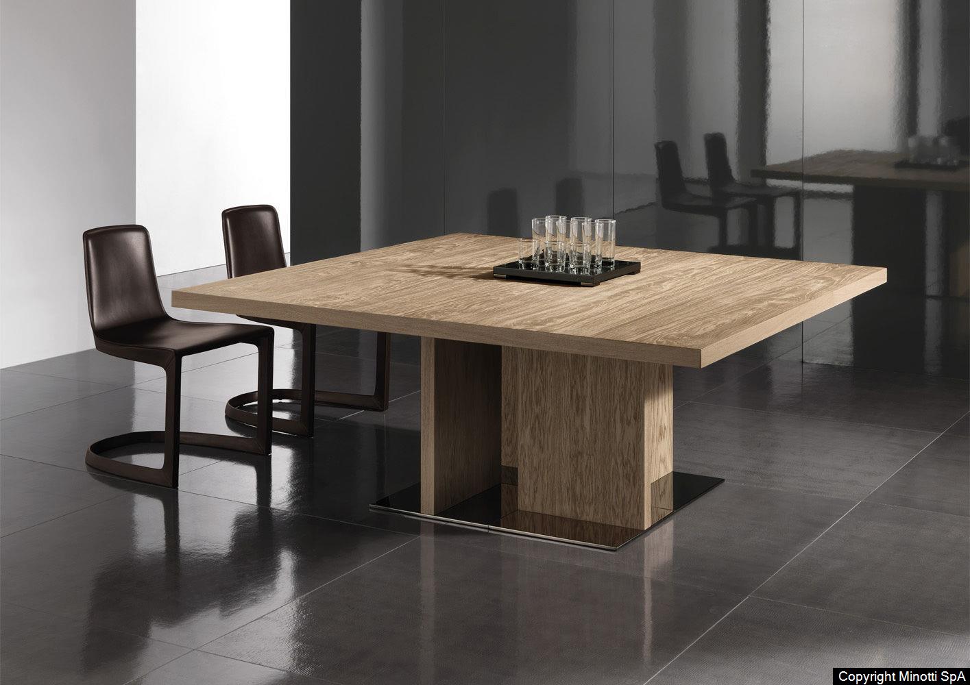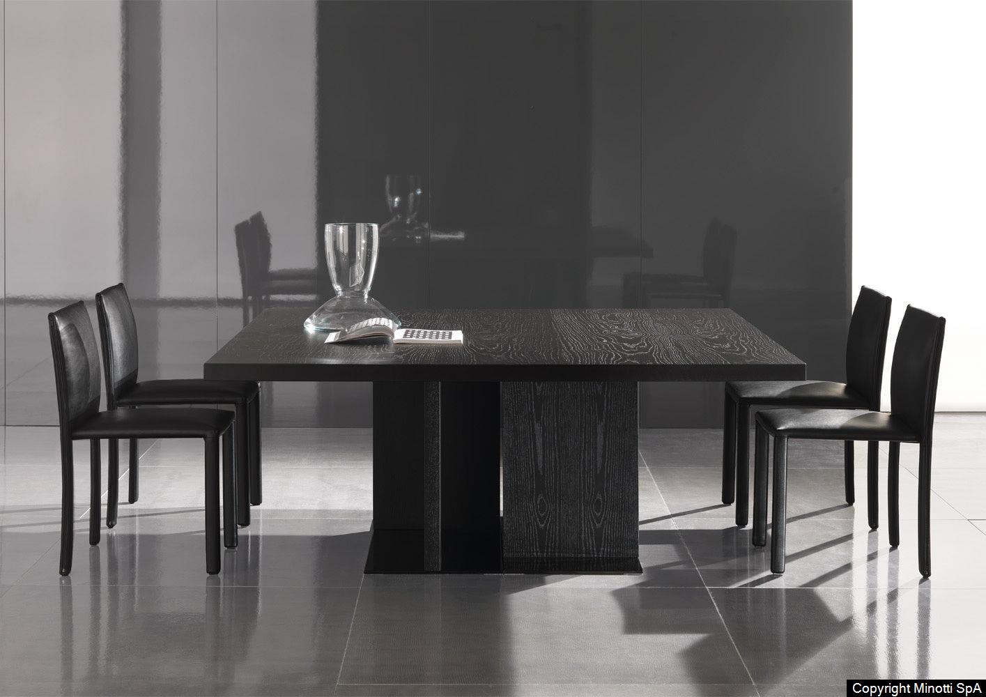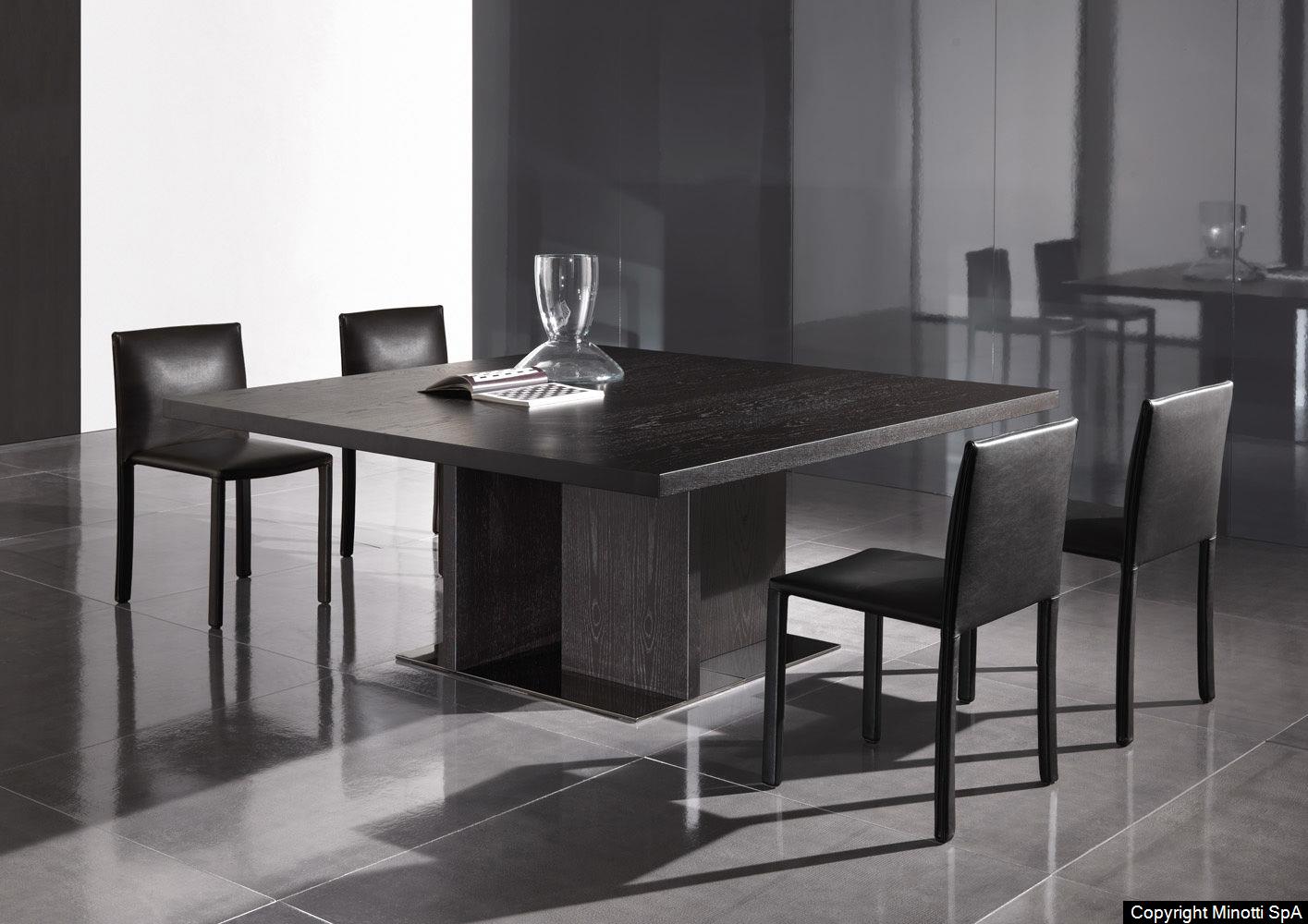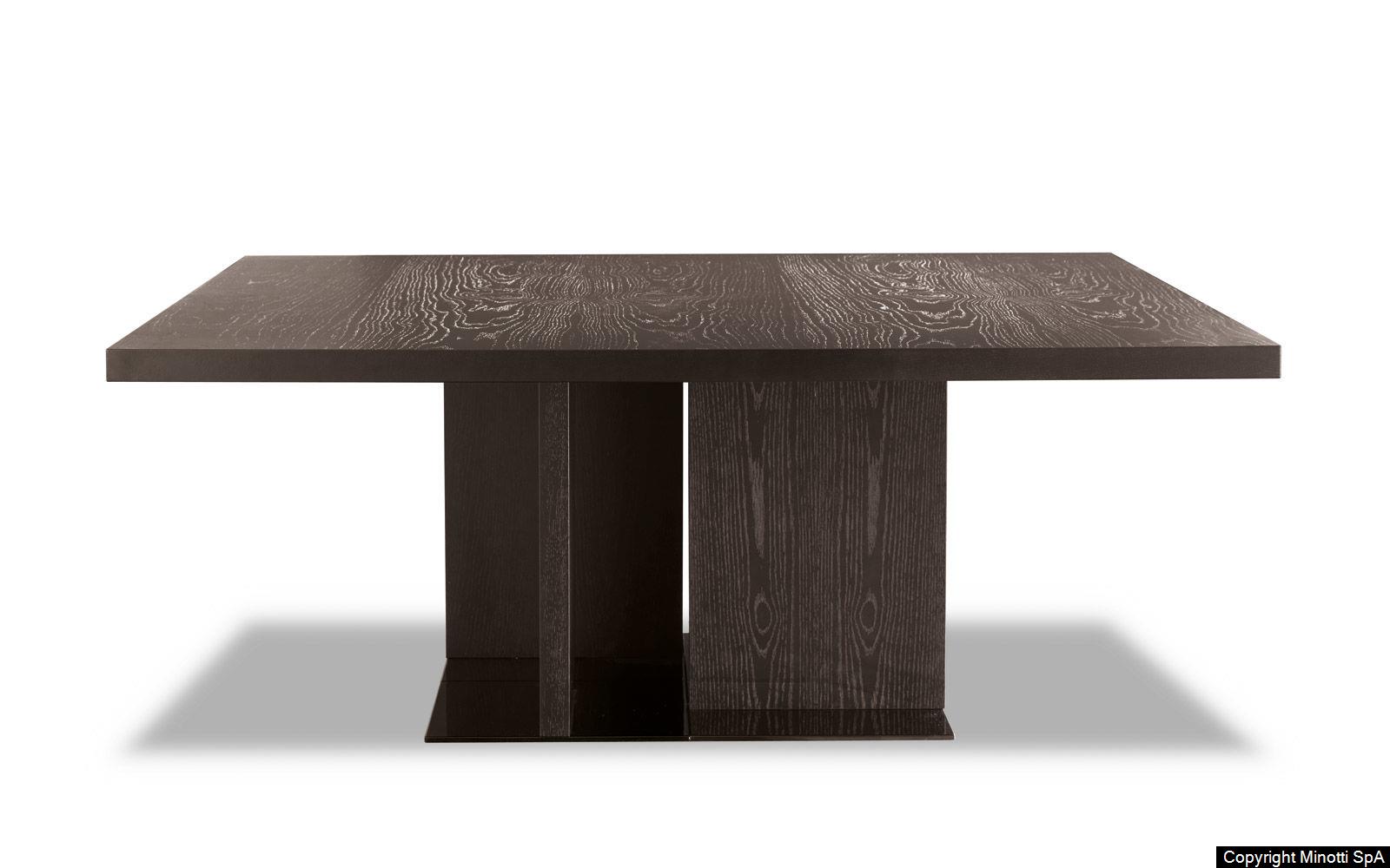 An impressively-sized table, and an inherently refined design achieved through the skillful combination of sophisticated materials. The base is composed of a metal plate finished in Bronze or Black-Nickel, while the structure and the table top are available in natural brushed oak, open pore stained oak in Grey, open pore lacquered oak in Moka or Black, and sandblasted open pore oak in semi-gloss Black or Dark Brown.