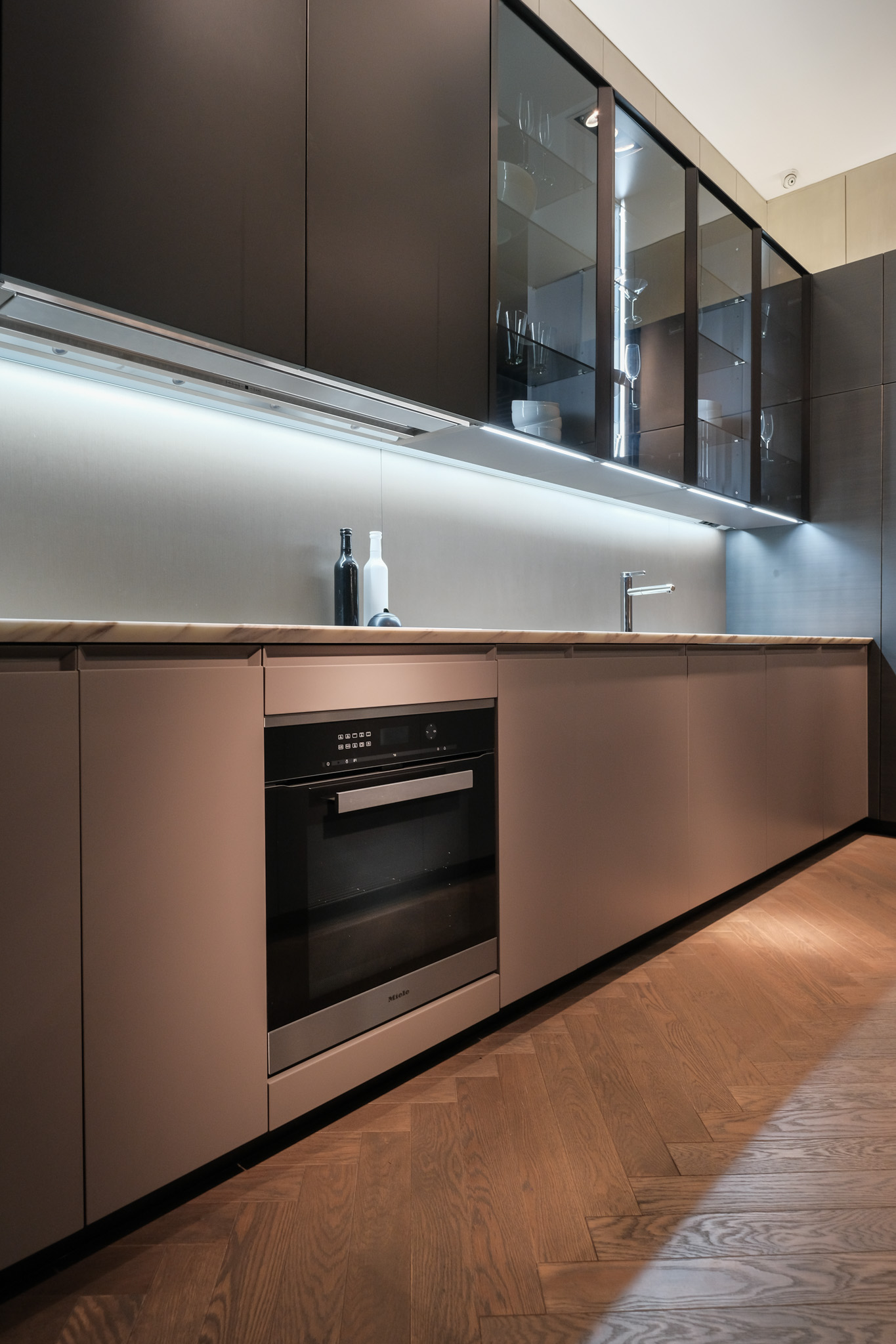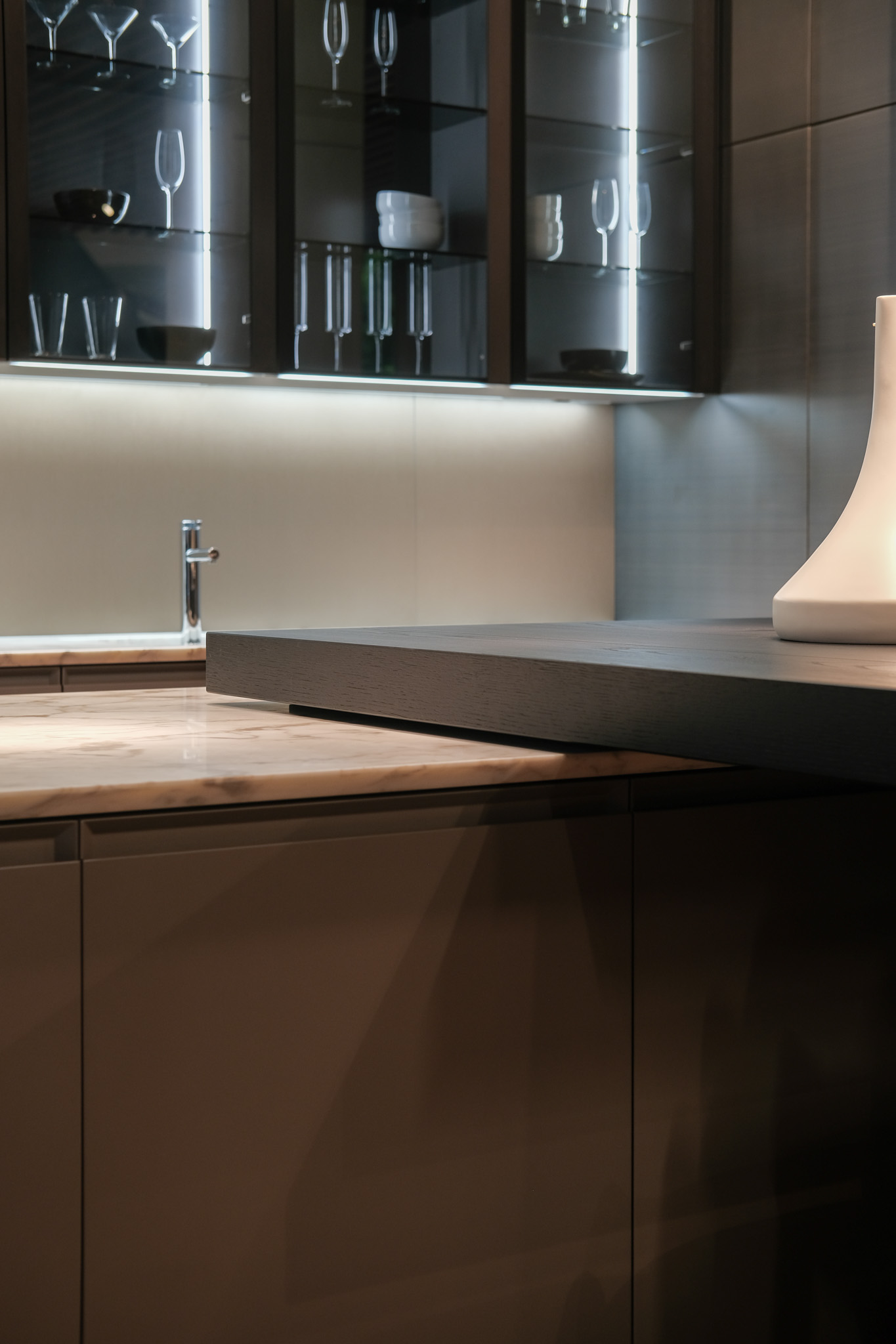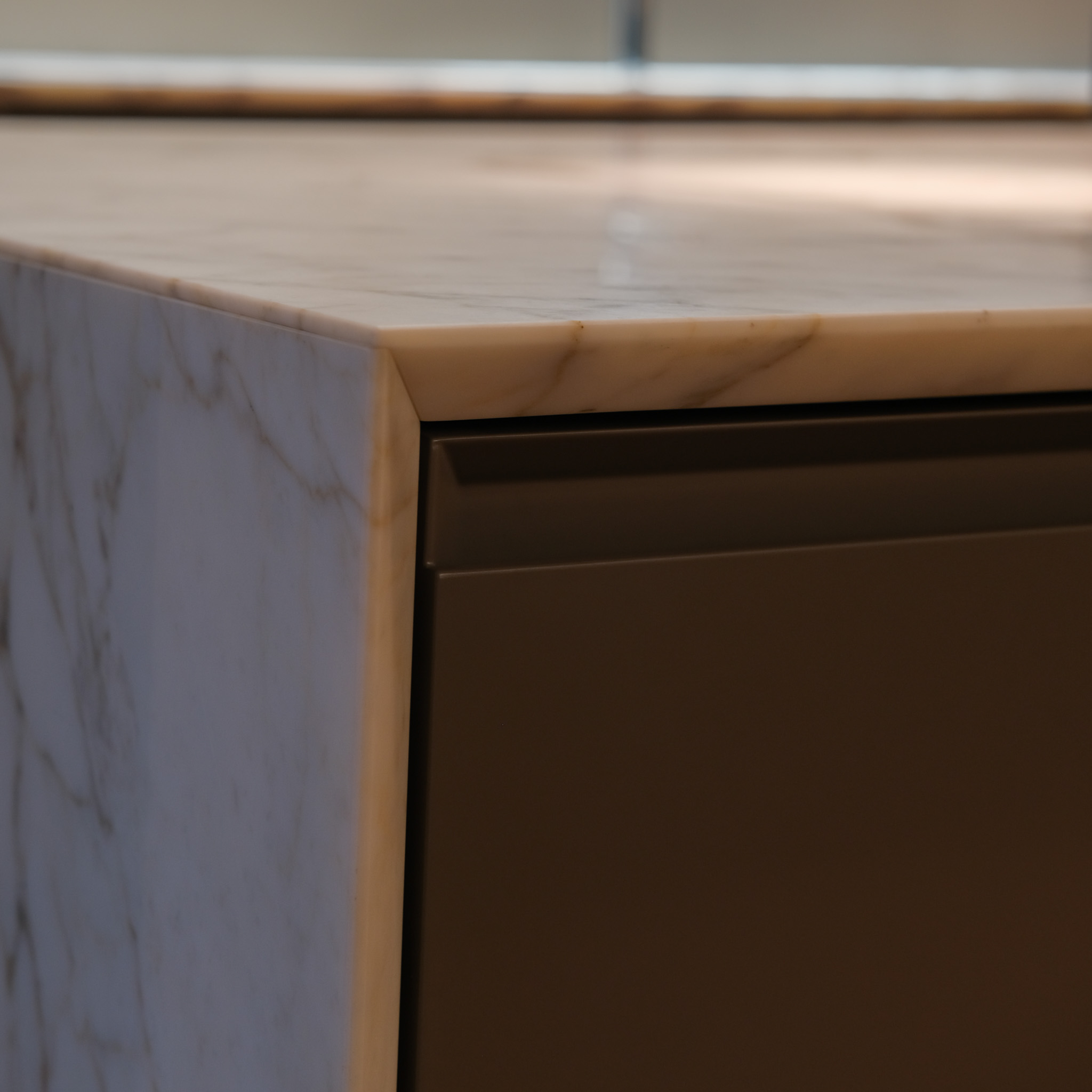Drawers: Verniciato Brown, Doors/Edge: Goff.Tortora Lacc. Metall. Bronzo Goff.Moka, Handles: Trail, Top: H.30 Mar. Calacatta Oro Lev. C/Smuss.45, Shelves: H.3 Goff.Moka, Backs: Olmo Nero, Plinth: H.IOO Goff. Moka