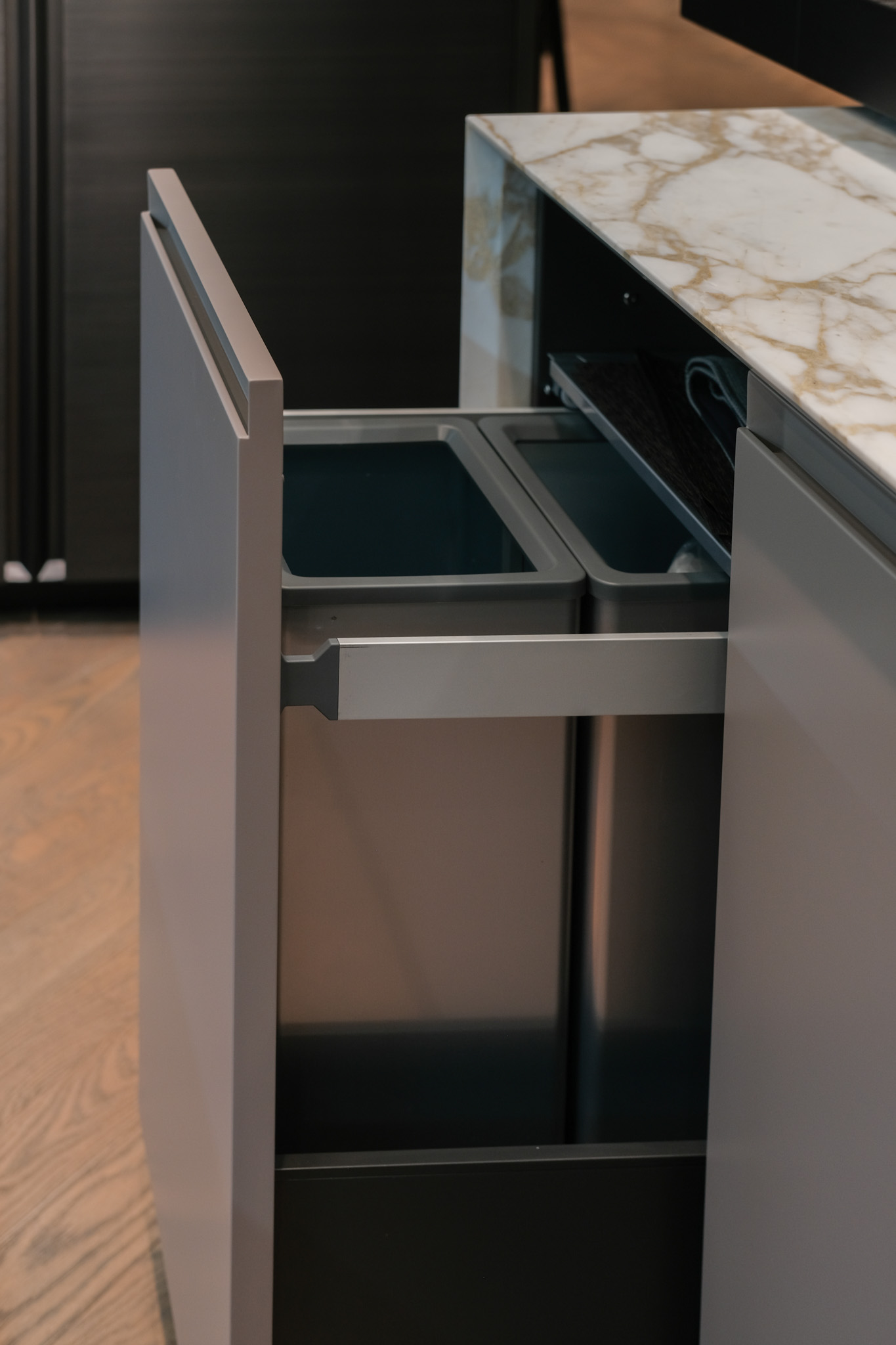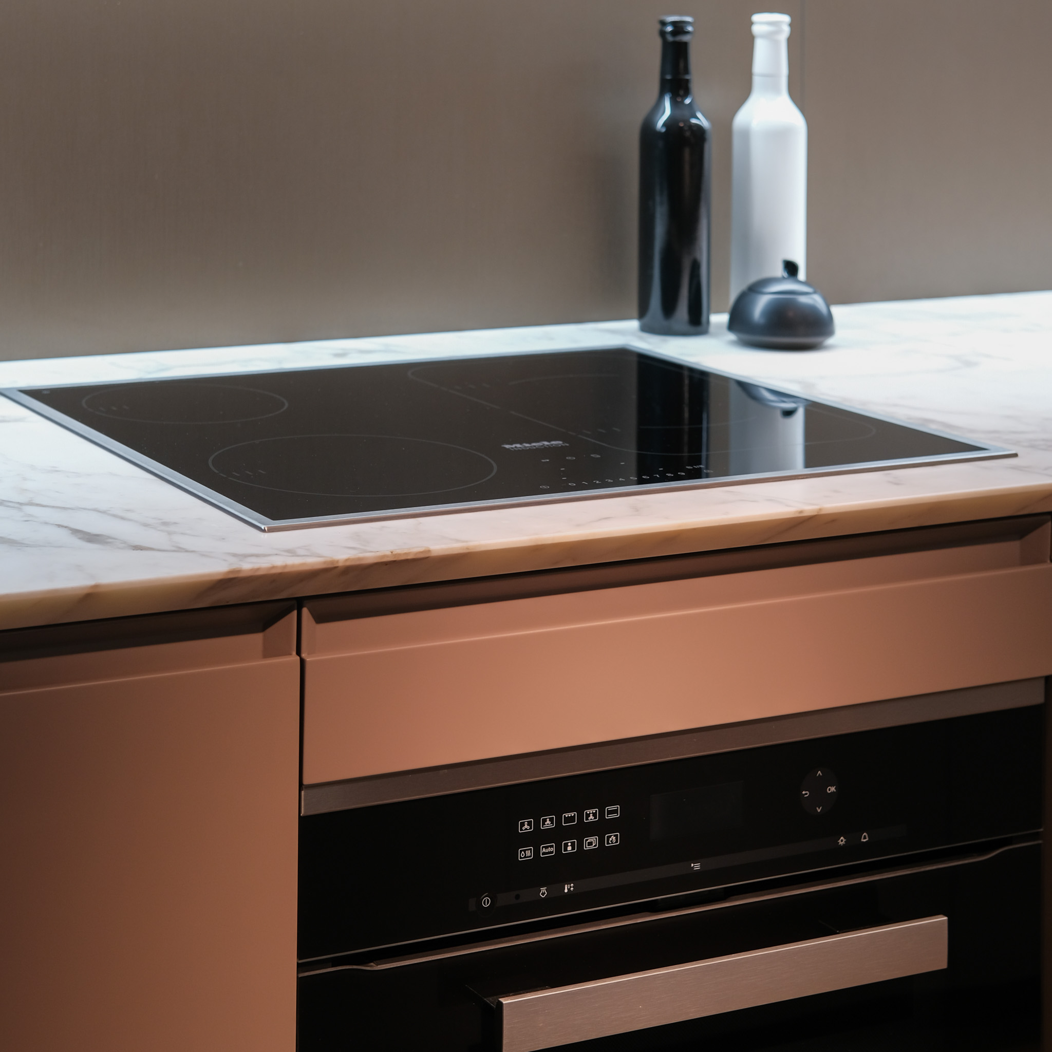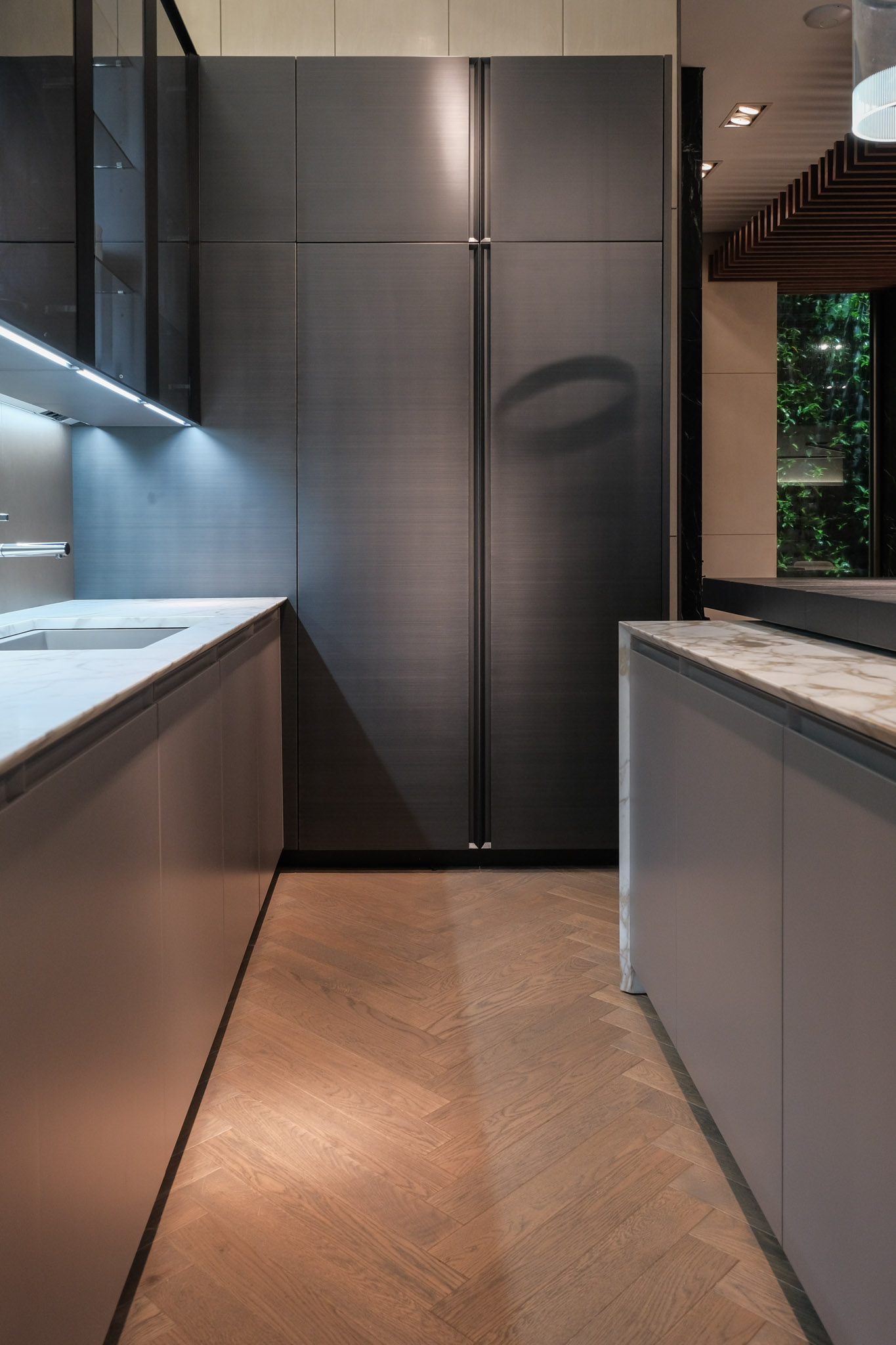 Drawers: Verniciato Brown, Doors/Edge: Goff.Tortora Lacc. Metall. Bronzo Goff.Moka, Handles: Trail, Top: H.30 Mar. Calacatta Oro Lev. C/Smuss.45, Shelves: H.3 Goff.Moka, Backs: Olmo Nero, Plinth: H.IOO Goff. Moka