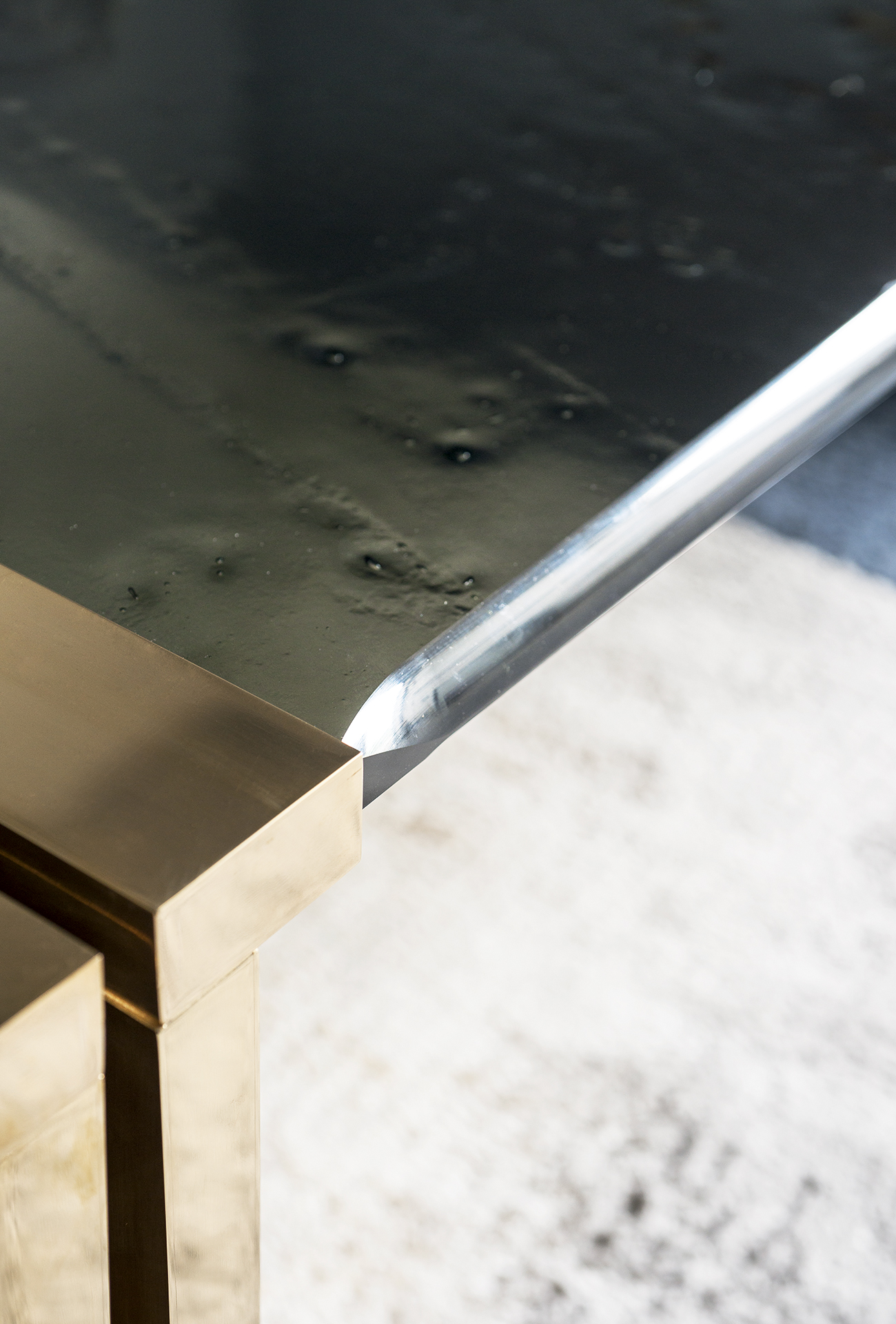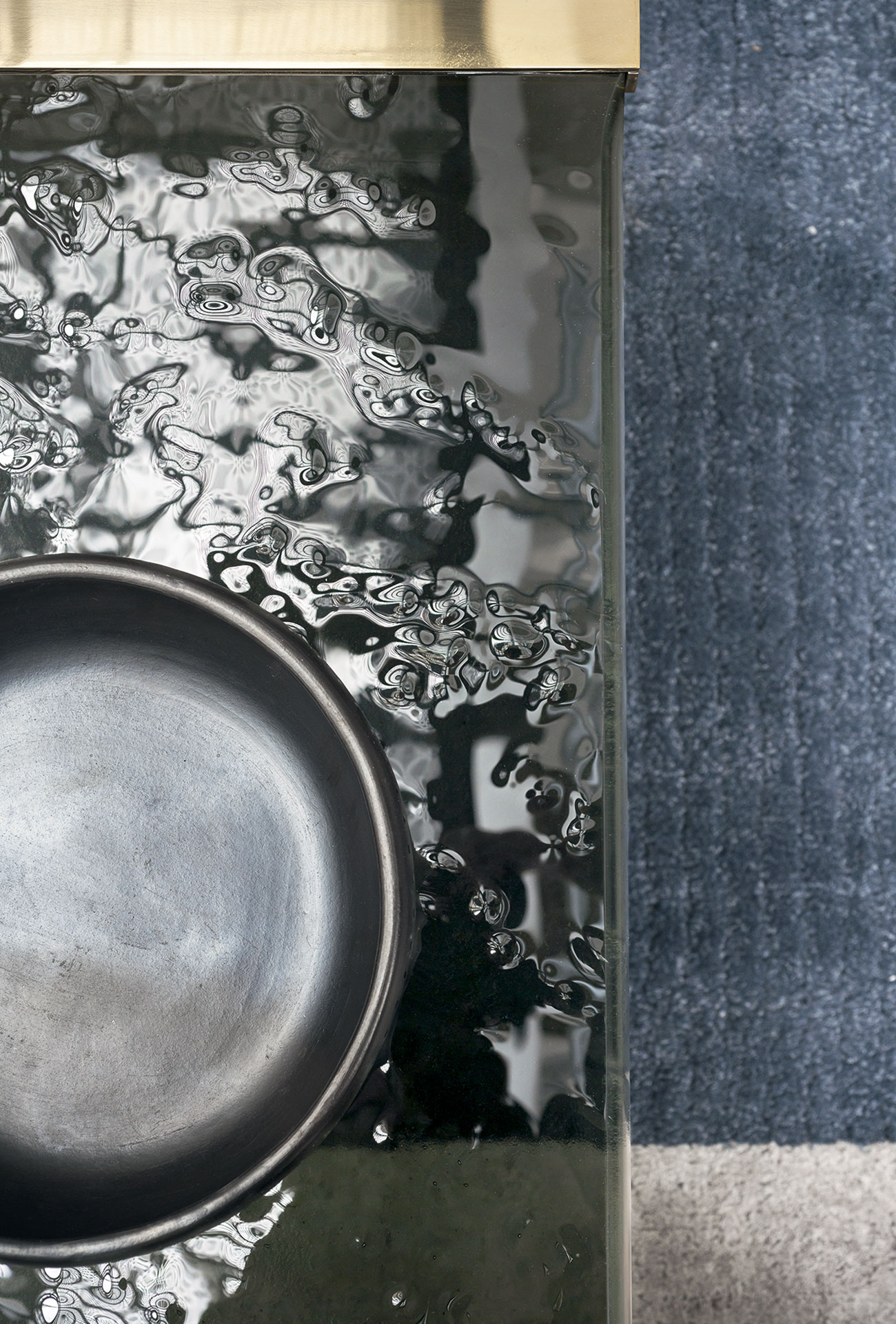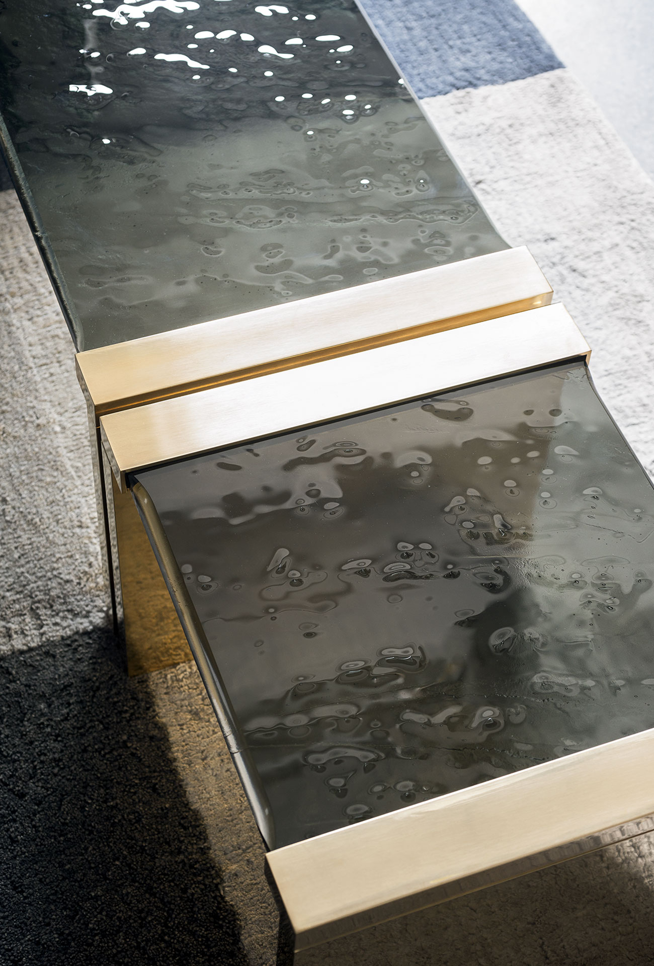 Polished brass legs with wax finish. Fused glass top of 20 mm thickness carried out with a particular technique aimed to obtain