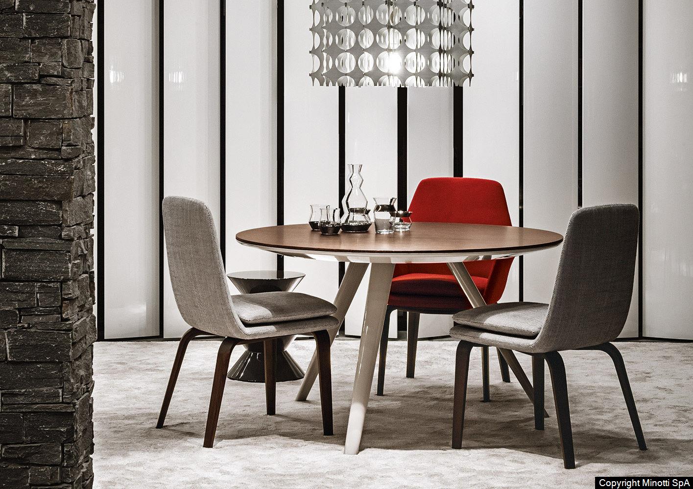 The supporting base comes in curved solid ash, with a very sophisticated design featuring various thicknesses throughout the length of the leg. The finishes are an open-pore Moka colored lacquered ash and the all-new Tobacco, a finish designed specifically for the new collection and also introduced for the Evans tables and the new version of Morrison.