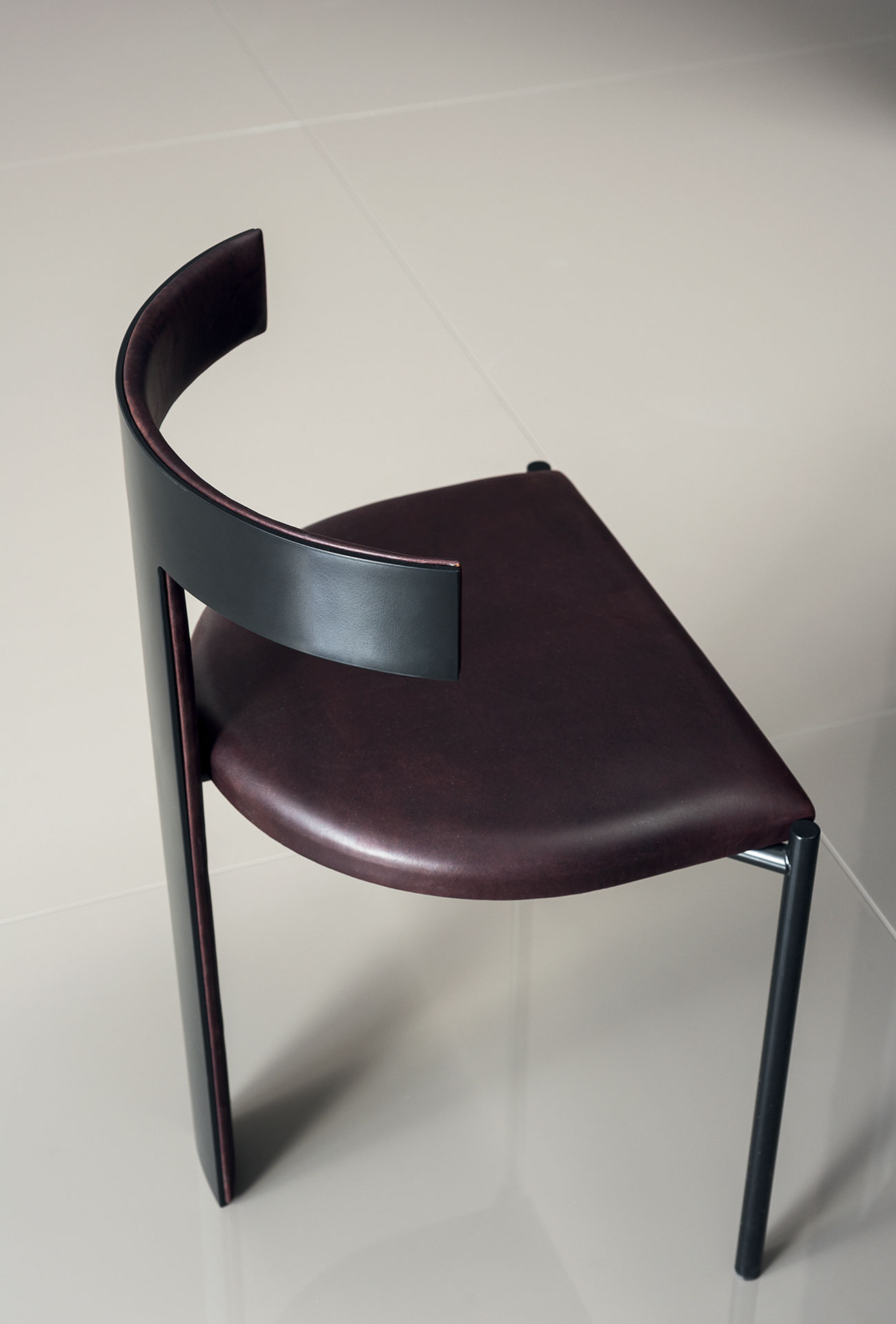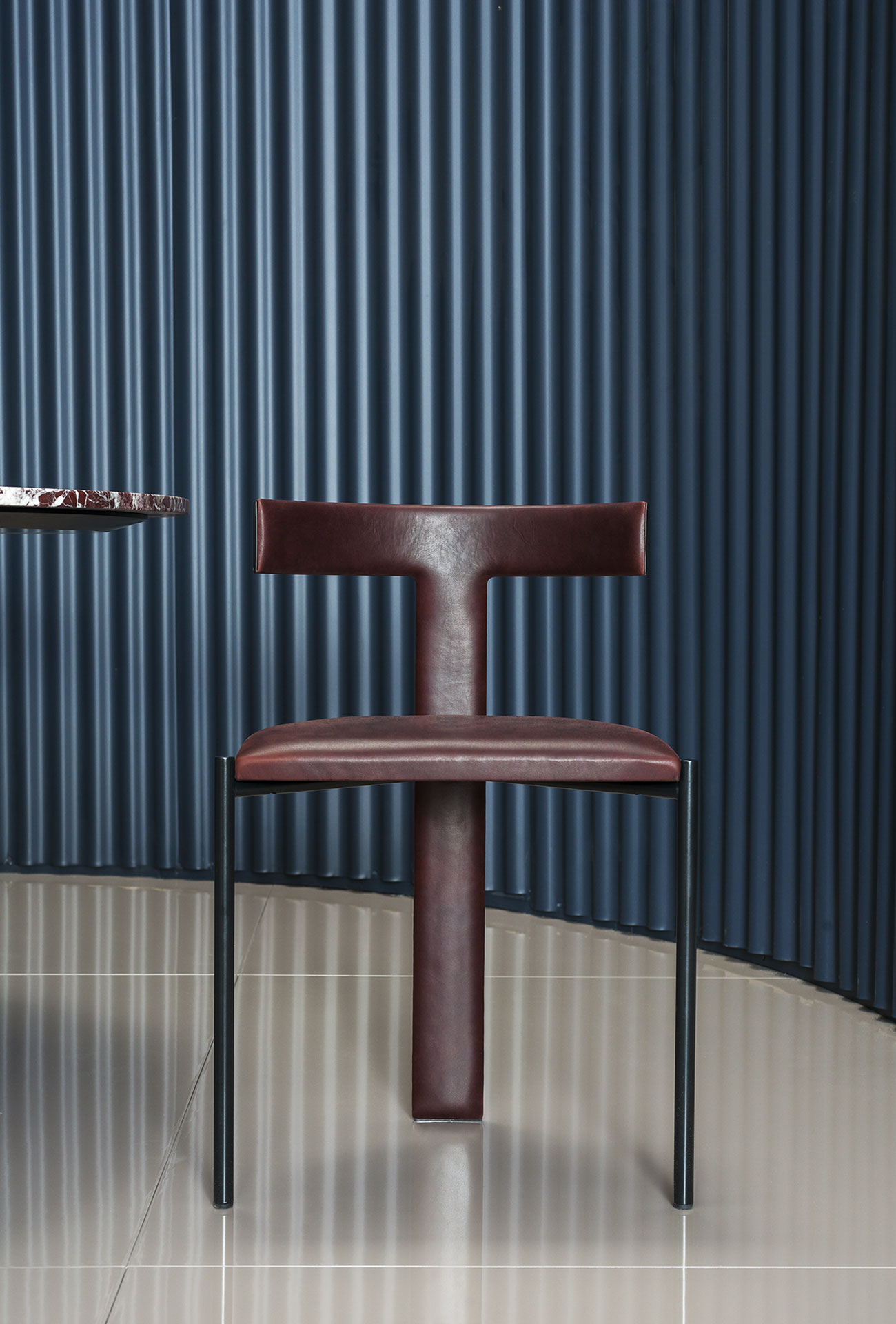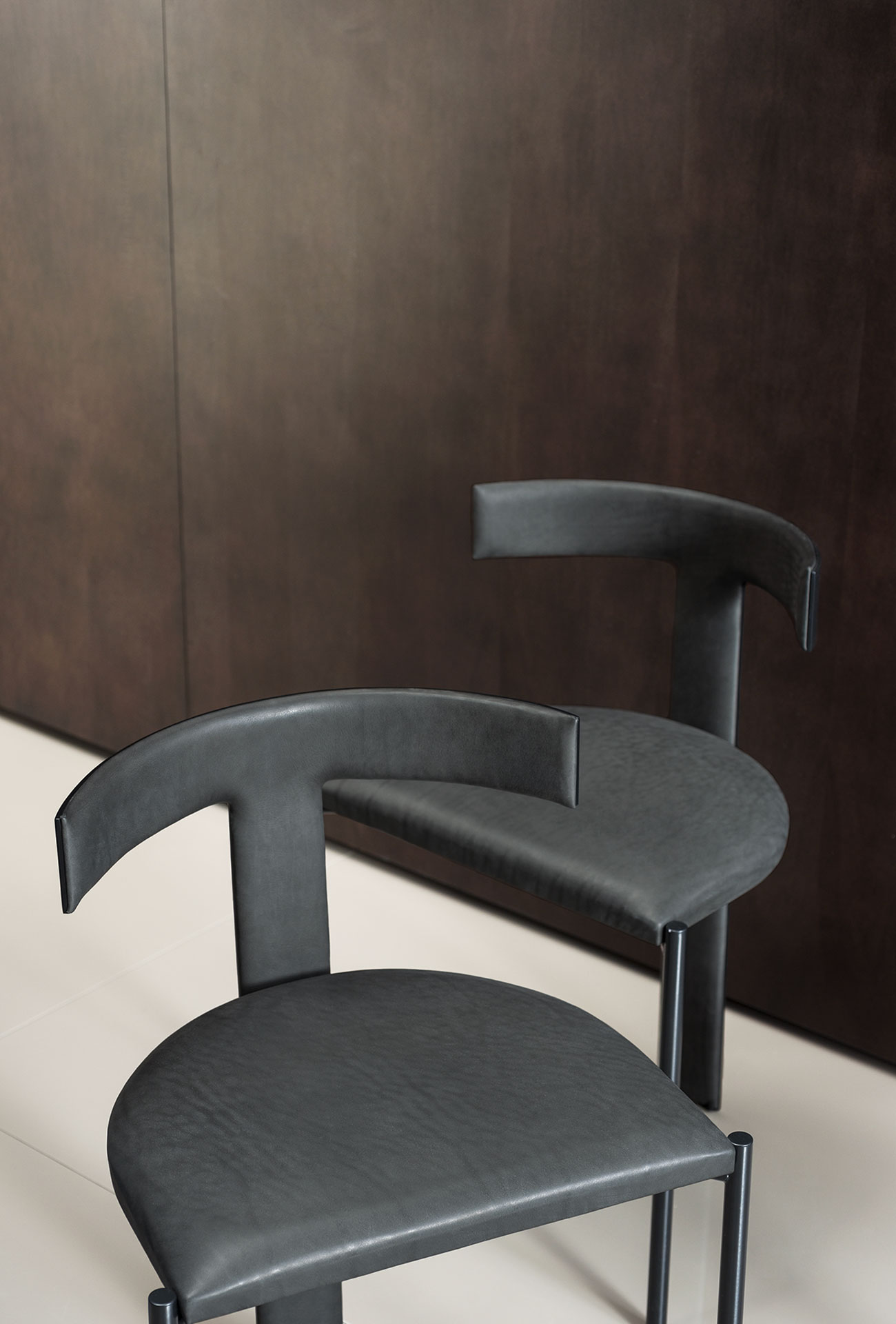 T-shaped back structure in matte black-varnished metal. Differentiated density polyurethane foam filling with acrylic fibre covering.