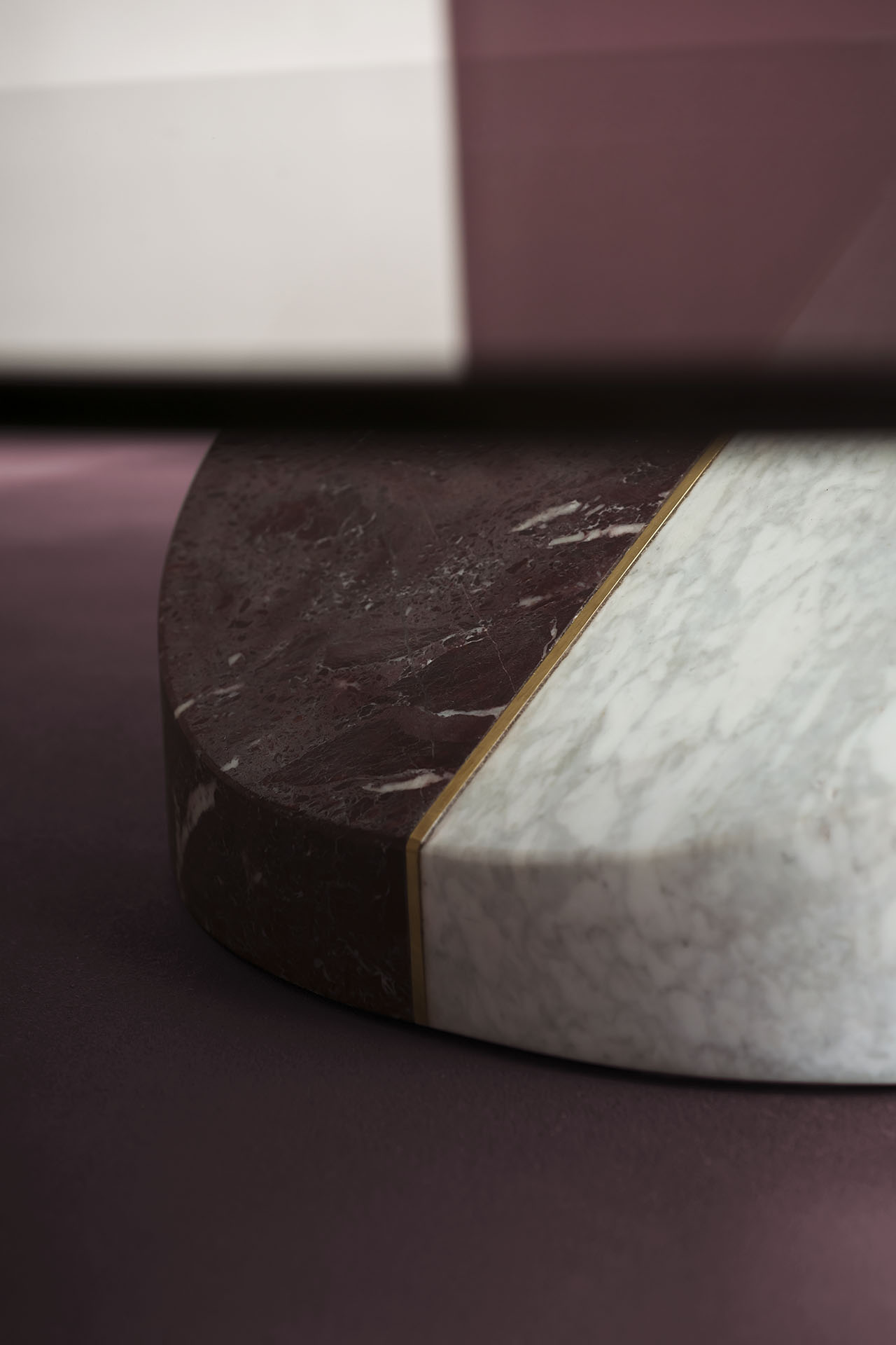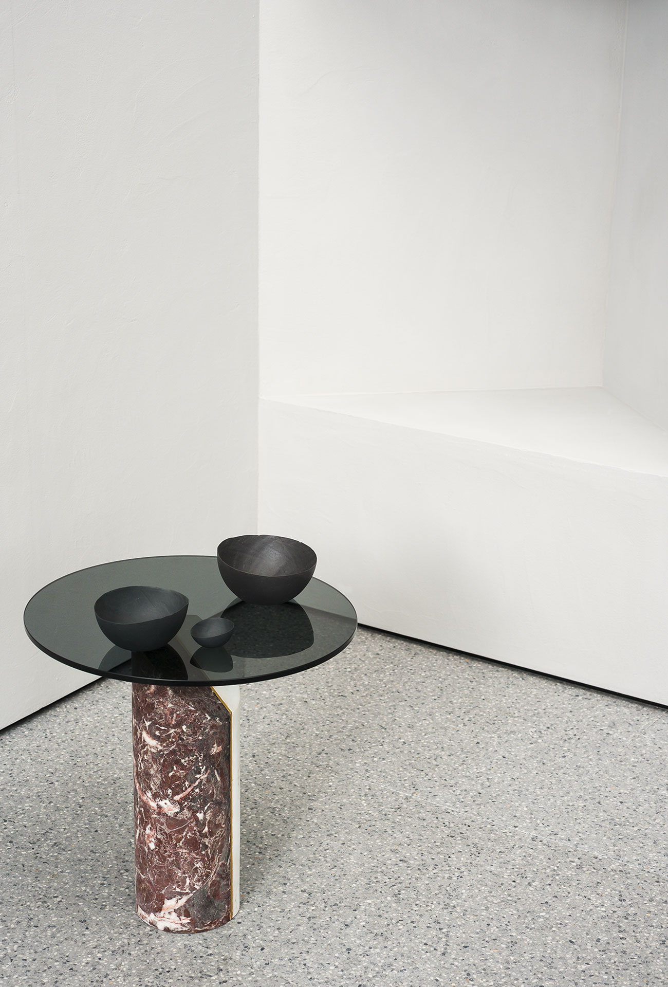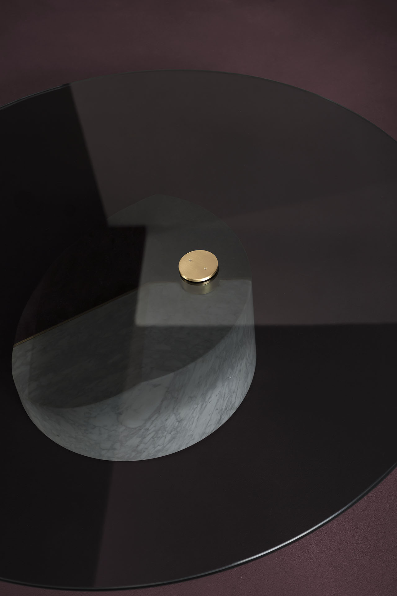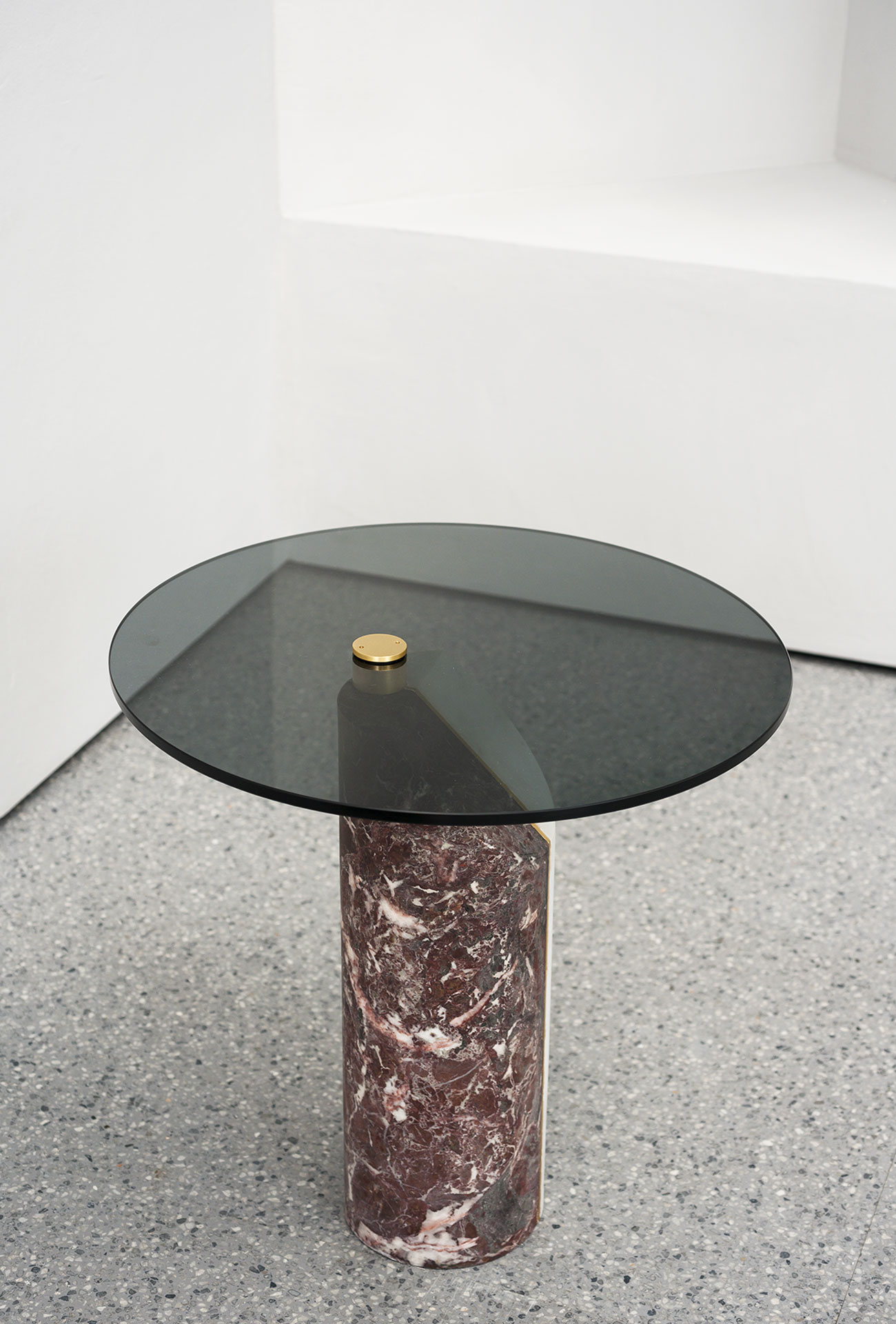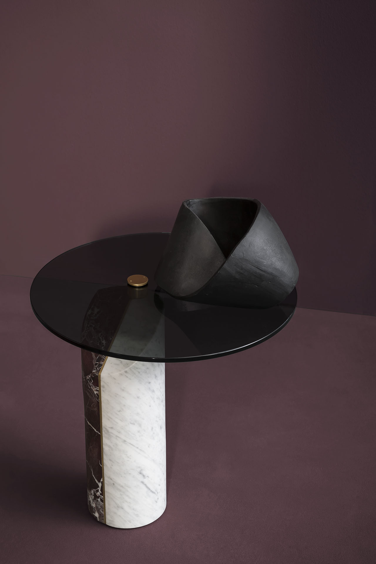 Base composed of two marble blocks, smoothed Bianco Gioia and Hidro Rosso Lepanto, with insert and connection with the top in satin-finished brass with clear matte finish. Revolving top in tempered fumée, paste-dyed glass, 10 mm thickness.